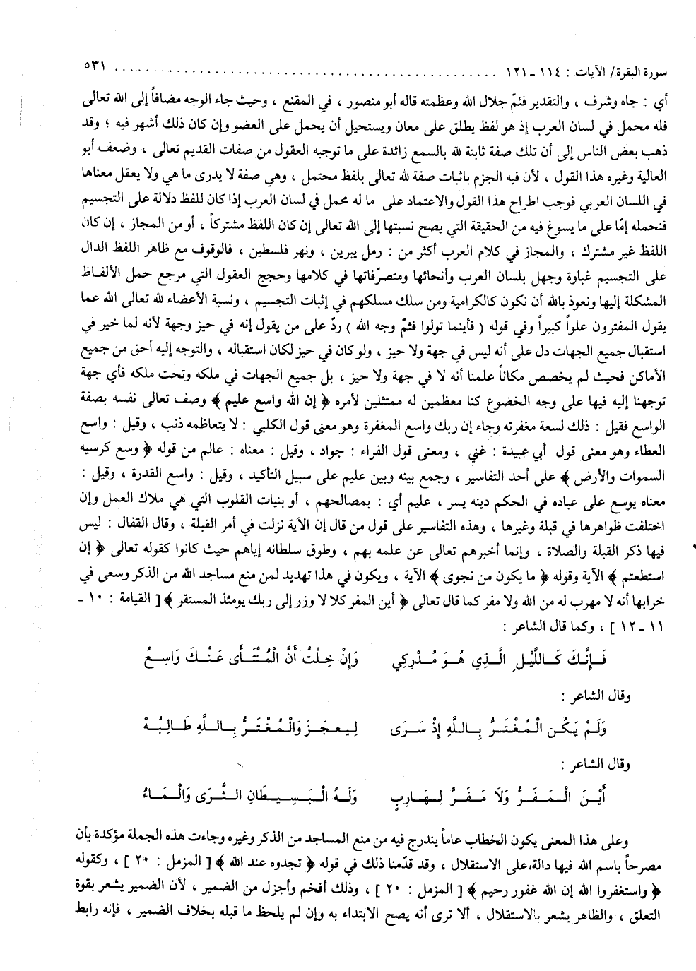 فالوقوف مع ظاهر اللفظ الدال على التجسيم غباوة وجهل بلسان العرب وأنحائها ومتصرّفاتها في كلامها ، وحجج العقول التي مرجع حمل الألفاظ المشكلة إليها . ونعوذ بالله أن نكون كالكرامية ، ومن سلك مسلكهم في إثبات التجسيم ونسبة الأعضاء لله ، تعالى الله عما يقول المفترون علواً كبيراً . وفي قوله : ) فَأَيْنَمَا تُوَلُّواْ فَثَمَّ وَجْهُ اللَّهِ ( ردّ على من يقول : إنه في حيز وجهة ، لأنه لما خير في استقبال جميع الجهات دل على أنه ليس في جهة ولا حيز ، ولو كان في حيز لكان استقباله والتوجه إليه أحق من جميع الأماكن . فحيث لم يخصص مكاناً ، علمنا أنه لا في جهة ولا حيز ، بل جميع الجهات في ملكه وتحت ملكه ، فأي جهة توجهنا إليه فيها على وجه الخضوع كنا معظمين له ممتثلين لأمره .
