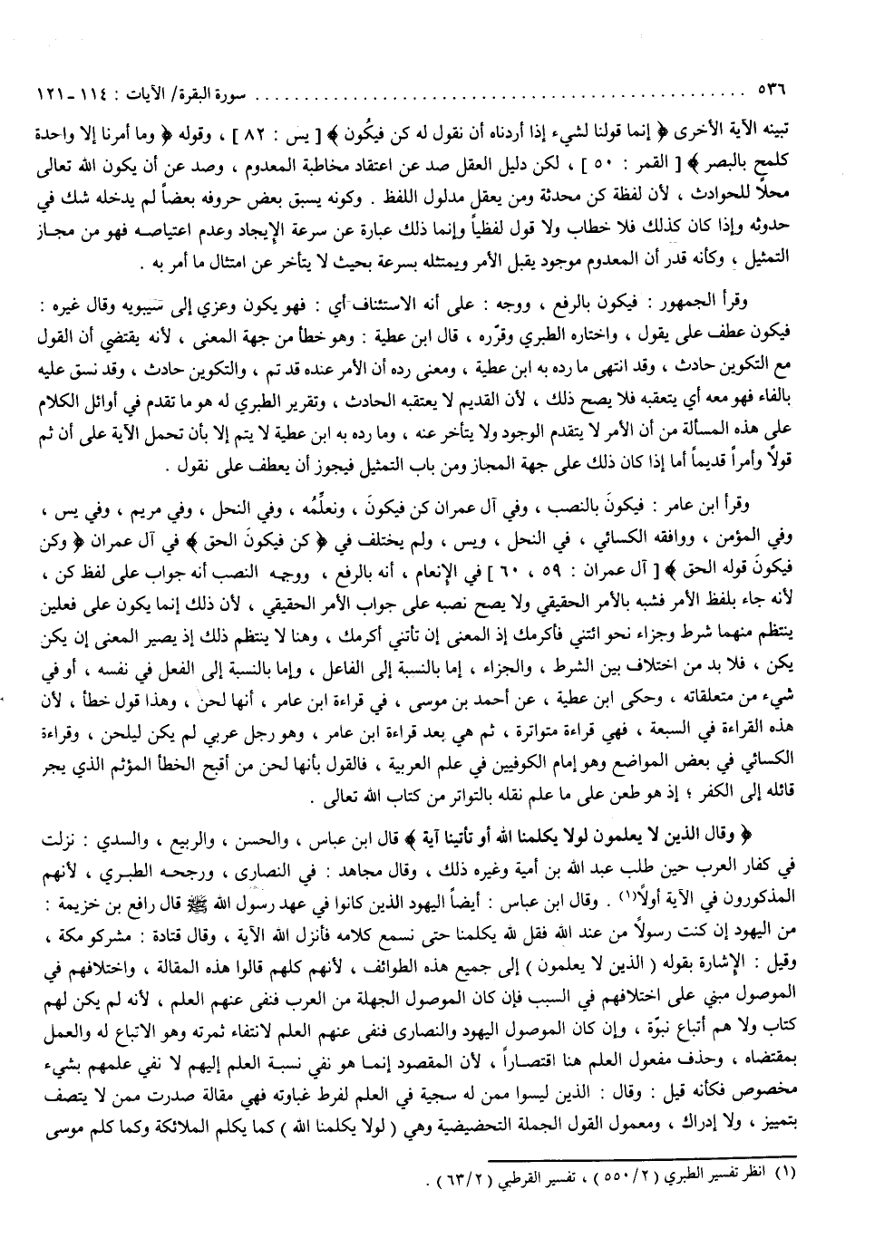 تبينه الآية الأخرى : ) إِنَّمَا قَوْلُنَا لِشَىْء إِذَا أَرَدْنَاهُ أَن نَّقُولَ لَهُ كُنْ فَيَكُونُ ( ، وقوله : ) وَمَا أَمْرُنَا إِلاَّ واحِدَةٌ كَلَمْحٍ بِالْبَصَرِ ). لكن دليل العقل صد عن اعتقاد مخاطبة المعدوم ، وصد عن أن يكون الله تعالى محلاً للحوادث ، لأن لفظة كن محدثة ، ومن يعقل مدلول اللفظ . وكونه يسبق بعض حروفه بعضاً ، لم يدخله شك في حدوثه ، وإذا كان كذلك ، فلا خطاب ولا قول لفظياً ، وإنما ذلك عبارة عن سرعة الإيجاد وعدم اعتياصه ، فهو من مجاز التمثيل ، وكأنه قدر أن المعدوم موجود يقبل الأمر ويمتثله بسرعة ، بحيث لا يتأخر عن امتثال ما أمر به . وقرأ الجمهور : فيكون بالرفع ، ووجه على أنه على الاستئناف ، أي فهو يكون ، وعزى إلى سيبويه . وقال غيره : فيكون عطف على يقول ، واختاره الطبري وقرّره . وقال ابن عطية : وهو خطأ من جهة المعنى ، لأنه يقتضي أن القول مع التكوين حادث ، وقد انتهى ما رده به ابن عطية . ومعنى رده : أن الأمر عنده قد تم ، والتكوين حادث ، وقد نسق عليه بالفاء ، فهو معه ، أي يعتقبه ، فلا يصح ذلك ، لأن القديم لا يعتقبه الحادث . وتقرير الطبري له هو ما تقدم في أوائل الكلام على هذه المسألة ، من أن الأمر لا يتقدم الوجود ولا يتأخر عنه . وما رده به ابن عطية لا يتم إلا بأن تحمل الآية على أن ثم قولاً وأمراً قديماً . أما إذا كان ذلك على جهة المجاز ، ومن باب التمثيل ، فيجوز أن يعطف على نقول . وقرأ ابن عامر : فيكون بالنصب ، وفي آل عمران : ) كُنْ فَيَكُونُ ( ونعلمه ، وفي النحل ، وفي مريم ، وفي يس ، وفي المؤمن . ووافقه الكسائي في النحل ويس ، ولم يختلف في ) كُنْ فَيَكُونُ ( الحق في آل عمران . ) وَكُنْ فَيَكُونُ ( قوله الحق في الأنعام أنه بالرفع ، ووجه النصب أنه جواب على لفظ كن ، لأنه جاء بلفظ الأمر ، فشبه بالأمر الحقيقي . ولا يصح نصبه على جواب الأمر الحقيقي ، لأن ذلك إنما يكون على فعلين ينتظم منهما شرط وجزاء نحوه : ائتني فأكرمك ، إذ المعنى : إن تأتني أكرمك . وهنا لا ينتظم ذلك ، إذ يصير المعنى : إن يكن يكن ، فلا بد من اختلاف بين الشرط والجزاء ، إما بالنسبة إلى الفاعل ، وإما بالنسبة إلى الفعل في نفسه ، أو في شيء من متعلقاته . وحكى ابن عطية ، عن أحمد بن موسى ، في قراءة ابن عامر : أنها لحن ، وهذا قول خطأ ، لأن هذه القراءة في السبعة ، فهي قراءة متواترة ، ثم هي بعد قراءة ابن عامر ، وهو رجل عربي ، لم يكن ليلحن . وقراءة الكسائي في بعض المواضع ، وهو إمام الكوفيين في علم العربية ، فالقول بأنها لحن ، من أقبح الخطأ المؤثم الذي يجر قائله إلى الكفر ، إذ هو طعن على ما علم نقله بالتواتر من كتاب الله تعالى .