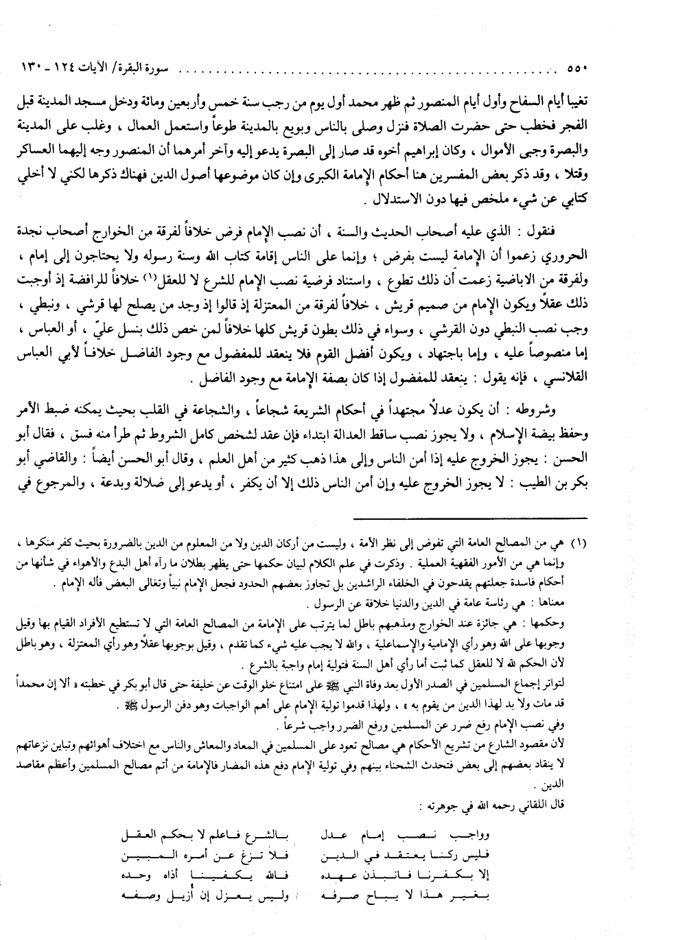 وقد ذكر بعض المفسرين هنا أحكام الإمامة الكبرى ، وإن كان موضوعها أصول الدين ، فهناك ذكرها ، لكني لا أخلي كتابي عن شيء ملخص فيها دون الاستدلال . فنقول : الذي عليه أصحاب الحديث والسنة ، أن نصب الإمام فرض ، خلافاً لفرقة من الخوارج ، وهم أصحاب نجدة الحروري . زعموا أن الإمامة ليست بفرض ، وإنما على الناس إقامة كتاب الله وسنة رسوله ، ولا يحتاجون إلى إمام ، ولفرقة من الإباضية زعمت أن ذلك تطوع . واستناد فرضية نصب الإمام للشرع لا للعقل ، خلافاً للرافضة ، إذ أوجبت ذلك عقلاً ، ويكون الإمام من صميم قريش ، خلافاً لفرقة من المعتزلة ، إذ قالوا : إذا وجد من يصلح لها قرشي ونبطي ، وجب نصب النبطي دون القرشي ، وسواء في ذلك بطون قريش كلها ، خلافاً لمن خص ذلك بنسل عليّ ، أو العباس ، إما منصوصاً عليه ، وإما اجتهاد ، ويكون أفضل القوم ، فلا ينعقد للمفضول مع وجود الفاضل ، خلافاً لأبي العباس القلانسي ، فإنه يقول : ينعقد للمفضول ، إذا كان بصفة الإمامة ، مع وجود الفاضل ، وشروطه : أن يكون عدلاً مجتهداً في أحكام الشريعة ، شجاعاً ، والشجاعة في القلب بحيث يمكنه ضبط الأمر وحفظ بيضة الإسلام ، ولا يجوز نصب ساقط العدالة ابتداء ، فإن عقد لشخص كامل الشروط ثم طرأ منه فسق ، فقال أبو الحسن : يجوز الخروج عليه إذا أمن الناس . وإلى هذا ذهب كثير من أهل العلم . وقال أبو الحسن أيضاً ، والقاضي أبو بكر بن الطيب : لا يجوز الخروج عليه ، وإن أمن الناس ذلك ، إلا أن يكفر أو يدعو إلى ضلالة وبدعة ، والمرجوع في