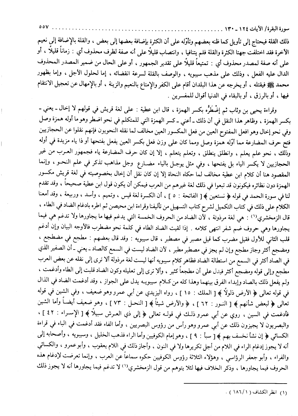 وقد تقدم لنا في سورة الحمد في قوله : ) نَسْتَعِينُ ( أن الكسرة لغة قيس وتميم وأسد وربيعة . وقد أمعنا الكلام على ذلك في ( كتاب التكميل لشرح كتاب التسهيل ) من تأليفنا . وقراءة ابن محيصن : ثم اطره ، بإدغام الضاد في الطاء . قال الزمخشري : هي لغة مرذولة ، لأن الضاد من الحروف الخمسة التي يدغم فيها ما يجاورها ، ولا تدغم هي فيما يجاورها ، وهي حروف ضم شفر . انتهى كلامه . إذا لقيت الضاد الطاء في كلمة نحو مضطرب ، فالأوجه البيان ، وإن أدغم قلب الثاني للأول فقيل : مضرب ، كما قيل : مصبر في مصطبر . قال سيبويه : وقد قال بعضهم : مطجع ، في مضطجع ومضجع أكثر ، وجاز مطجع ، وإن لم يجز في مصطبر مطبر ، لأن الضاد ليست في السمع كالصاد ، يعني أن الصفير الذي في الصاد أكثر في السمع من استطالة الضاد . فظاهر كلام سيبويه أنها ليست لغة مرذولة ، ألا ترى إلى نقله عن بعض العرب مطجع ، وإلى قوله : ومضجع أكثر ، فيدل على أن مطجعا كثير ؟ وألا ترى إلى تعليله ، وكون الضاد قلبت إلى الطاء وأدغمت ، ولم يفعل ذلك بالصاد ، وإبداء الفرق بينهما ؟ وهذا كله من كلام سيبويه ، يدل على الجوار . وقد أدغمت الضاد في الذال في قوله تعالى : ) الاْرْضَ ذَلُولاً ( ، رواه اليزيدي ، عن أبي عمرو ، وهو ضعيف . وفي الشين في قوله تعالى : ) لِبَعْضِ شَأْنِهِمْ ( ، ( وَالاْرْضِ شَيْئًا ( ، وهو ضعيف أيضاً . وأما الشين فأدغمت في السين . روي عن أبي عمرو ذلك في قوله تعالى : ) إِلَى ذِى الْعَرْشِ سَبِيلاً ( ، والبصريون لا يجيزون ذلك عن أبي عمرو ، وهو رأس من رؤوس البصريين . وأما الفاء فقد أدغمت في الباء في قراءة الكسائي : ) إِن نَّشَأْ نَخْسِفْ بِهِمُ ( ، وهو إمام الكوفيين . وأما الراء ، فذهب الخليل وسيبويه وأصحابه إلى أنه لا يجوز إدغام الراء في اللام من أجل تكريرها ، ولا في النون . وأجاز ذلك في اللام : يعقوب ، وأبو عمرو ، والكسائي ، والفراء ، وأبو جعفر الرؤاسي ، وهؤلاء الثلاثة رؤوس الكوفيين ، حكوه سماعاً عن العرب . وإنما تعرضت لإدغام هذه الحروف فيما يجاورها ، وذكر الخلاف فيها ، لئلا يتوهم من قول الزمخشري : لا تدغم فيما يجاورها ، أنه لا يجوز ذلك