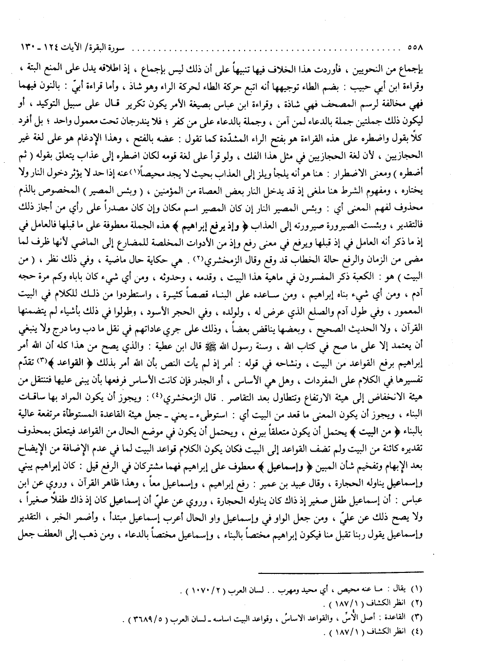 ( وَإِذْ يَرْفَعُ إِبْراهِيمُ ( : هذه الجملة معطوفة على ما قبلها ، فالعامل في إذ ما ذكر أنه العامل في إذ قبلها . ويرفع في معنى رفع ، وإذ من الأدوات المخلصة للمضارع إلى الماضي ، لأنها ظرف لما مضى من الزمان . والرفع حالة الخطاب قد وقع . وقال الزمخشري : هي حكاية حال ماضية ، وفي ذلك نظر . من البيت : هو الكعبة . ذكر المفسرون في ماهية هذا البيت وقدمه وحدوثه ، ومن أي شيء كان باباه ، وكم مرة حجة آدم ، ومن أي شيء بناه إبراهيم ، ومن ساعده على البناء ، قصصاً كثيرة . واستطردوا من ذلك للكلام في البيت المعمور ، وفي طول آدم ، والصلع الذي عرض له ولولده ، وفي الحجر الأسود ، وطولوا في ذلك بأشياء لم يتضمنها القرآن ولا الحديث الصحيح . وبعضها يناقض بعضاً ، وذلك على جري عاداتهم في نقل ما دب وما درج . ولا ينبغي أن يعتمد إلا على ما صح في كتاب الله وسنة رسول الله ( صلى الله عليه وسلم ) ) . قال ابن عطية : والذي يصح من هذا كله أن الله أمر إبراهيم برفع القواعد من البيت ونشاحه في قوله : أمر ، إذ لم يأت النص بأن الله أمر بذلك . ) الْقَوَاعِدِ ( : تقدّم تفسيرها في الكلام على المفردات ، وهل هي الأساس أو الجدر ؟ فإن كانت الأساس ، فرفعها بأن يبني عليها ، فتنتقل من هيئة الانخفاض إلى هيئة الارتفاع ، وتتطاول بعد التقاصر . قال الزمخشري : ويجوز أن يكون المراد بها ساقات البناء ، ويجوز أن يكون المعنى ما قعد من البيت ، أي استوطىء ، يعني جعل هيئة القاعدة المستوطأة مرتفعة عالية بالبناء .
