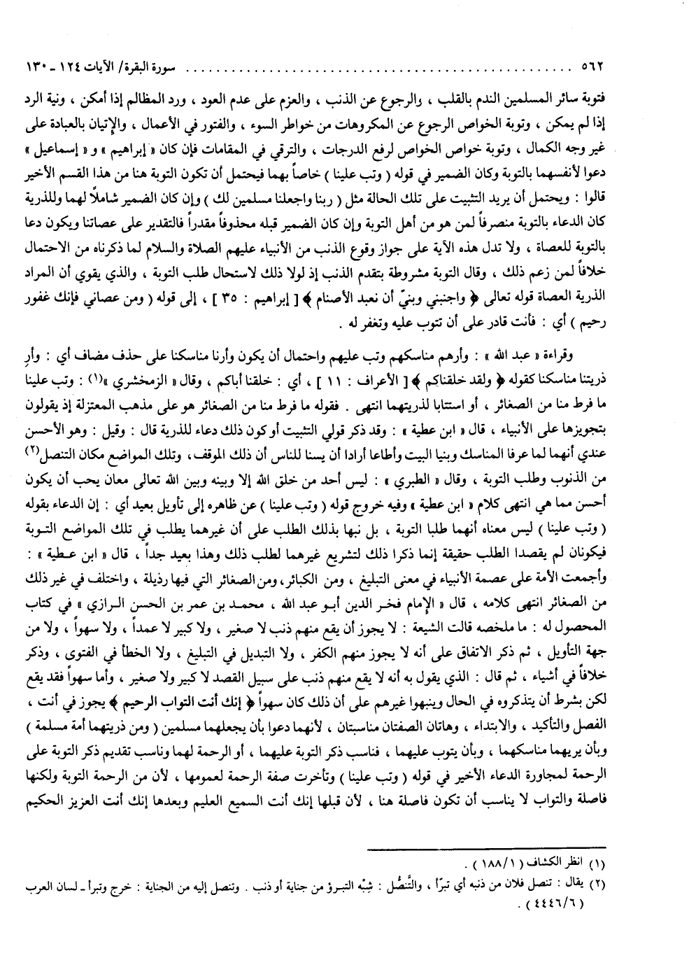 فتوبة سائر المسلمين الندم بالقلب ، والرجوع عن الذنب ، والعزم على عدم العود ، ورد المظالم إذا أمكن ، ونية الرد إذا لم يمكن ، وتوبة الخواص الرجوع عن المكروهات من خواطر السوء ، والفتور في الأعمال ، والإتيان بالعبادة على غير وجه الكمال ، وتوبة خواص الخواص لرفع الدرجات ، والترقي في المقامات ، فإن كان إبراهيم وإسماعيل دعوا لأنفسهما بالتوبة ، وكان الضمير في قوله : ) وَتُبْ عَلَيْنَا ( خاصاً بهما ، فيحتمل أن تكون التوبة هنا من هذا القسم الأخير . قالوا : ويحتمل أن يريد التثبيت على تلك الحالة مثل : ) رَبَّنَا وَاجْعَلْنَا مُسْلِمَيْنِ لَكَ ). وإن كان الضمير شاملاً لهما وللذرية ، كان الدعاء بالتوبة منصرفاً لمن هو من أهل التوبة . وإن كان الضمير قبله محذوفاً مقدراً ، فالتقدير على عصاتنا ، ويكون دعا بالتوبة للعصاة . ولا تدل هذه الآية على جواز وقوع الذنب من الأنبياء عليهم الصلاة والسلام ، لما ذكرناه من الاحتمال ، خلافاً لمن زعم ذلك وقال : التوبة مشروطة بتقدم الذنب ، إذ لولا ذلك لاستحال طلب التوبة . والذي يقوي أن المراد الذرية العصاة قوله تعالى : ) وَاجْنُبْنِى وَبَنِىَّ أَن نَّعْبُدَ الاْصْنَامَ ( ، إلى قوله : ) وَمَنْ عَصَانِى فَإِنَّكَ غَفُورٌ رَّحِيمٌ ( ، أي فأنت قادر على أن تتوب عليه وتغفر له ، وقراءة عبد الله ، وأرهم مناسكهم ، وتب عليهم ، واحتمال أن يكون : وأرنا مناسكنا على حذف مضاف ، أي وأر ذريتنا مناسكنا ، كقوله : ولقد خلقناكم ، أي خلقنا أباكم . وقال الزمخشري : وتب علينا ما فرط منا من الصغائر ، أو استتاباً لذريتهما . انتهى . فقوله : ما فرط منا من الصغائر هو على مذهب المعتزلة ، إذ يقولون بتجويزها على الأنبياء . قال ابن عطية : وقد ذكر قولي التثبيت ، أو كون ذلك دعاء للذرية ، قال : وقيل وهو الأحسن عندي أنهما لما عرفا المناسك ، وبنيا البيت ، وأطاعا ، أرادا أن يسنا للناس أن ذلك الموقف وتلك المواضع مكان التنصل من الذنوب وطلب التوبة . وقال الطبري : ليس أحد من خلق الله إلا وبينه وبين الله تعالى معان يحب أن كون أحسن مما هي . انتهى كلام ابن عطية ، وفيه خروج قوله : وتب علينا عن ظاهره إلى تأويل بعيد ، أي إن الدعاء بقوله : وتب علينا ، ليس معناه أنهما طلبا التوبة ، بل نبها بذلك الطلب على أن غيرهما يطلب في تلك المواضع التوبة ، فيكونان لم يقصدا الطلب حقيقة ، إنما ذكرا ذلك لتشريع غيرهما لطلب ذلك ، وهذا بعيد جداً . قال ابن عطية : وأجمعت الأمة على عصمة الأنبياء في معنى التبليغ ، ومن الكبائر ومن الصغائر التي فيها رذيلة ، واختلف في غير ذلك من الصغائر . انتهى كلامه . قال الإمام فخر الدين أبو عبد الله محمد بن عمر بن الحسن الرازي ، في ( كتاب المحصول ) له ما ملخصه : قالت الشيعة ، لا يجوز أن يقع منهم ذنب ، لا صغير ولا كبير ، لا عمداً ولا سهواً ، ولا من جهة التأويل . ثم ذكر الاتفاق على أنه لا يجوز منهم الكفر ، ولا التبديل في التبليغ ، ولا الخطأ في الفتوى . وذكر خلافاً في أشياء ، ثم قال الذي يقول به إنه لا يقع منهم ذنب على سبيل القصد ، لا كبير ولا صغير ، وأما سهواً فقد يقع ، لكن بشرط أن يتذكروه في الحال وينبهوا غيرهم على أن ذلك كان سهواً .
