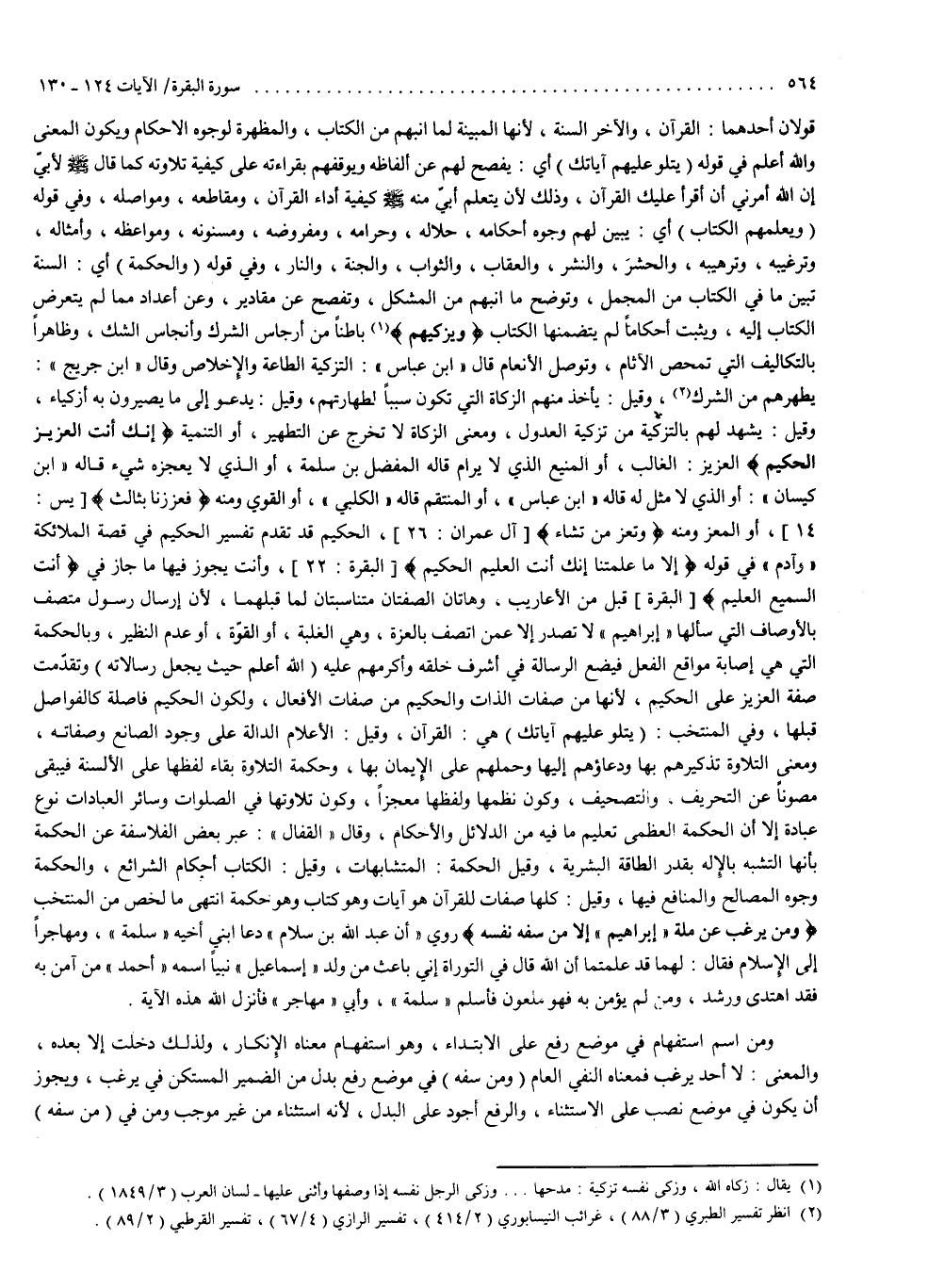 قولان : أحدهما ، القرآن والآخر السنة ، لأنها المبينة لما أنبهم من الكتاب ، والمظهرة لوجوه الأحكام . ويكون المعنى ، والله أعلم ، في قوله : ) يَتْلُو عَلَيْهِمْ ءايَاتِكَ ( ، أي يفصح لهم عن ألفاظه ويوقفهم بقراءته على كيفية تلاوته ، كما قال ( صلى الله عليه وسلم ) ) لأبي : ( إن الله أمرني أن أقرأ عليك القرآن ) ، وذلك لأن يتعلم أبي منه ( صلى الله عليه وسلم ) ) كيفية أداء القرآن ومقاطعه ومواصلة . وفي قوله : ) وَيُعَلّمُهُمُ الْكِتَابَ ( ، أي يبين لهم وجوه أحكامه : حلاله وحرامه ، ومفروضه ، ومسنونه ، ومواعظه ، وأمثاله ، وترغيبه ، وترهيبه ، والحشر ، والنشر ، والعقاب ، والثواب ، والجنة والنار . وفي قوله : والحكمة ، أي السنة تبين ما في الكتاب من المجمل ، وتوضح ما أنبهم من المشكل ، وتفصح عن مقادير ، وعن إعداد مما لم يتعرض الكتاب إليه ، ويثبت أحكاماً لم يتضمنها الكتاب . ) وَيُزَكّيهِمْ ( باطناً من أرجاس الشرك وأنجاس الشك ، وظاهراً بالتكاليف التي تمحص الآثام وتوصل الأنعام . قال ابن عباس : التزكية : الطاعة والإخلاص . وقال ابن جريج : يطهرهم من الشرك . وقيل : يأخذ منهم الزكاة التي تكون سبباً لطهارتهم . وقيل : يدعوا إلى ما يصيرون به أزكياء . وقيل : يشهد لهم بالتزكية من تزكية العدول ، ومعنى الزكاة لا تخرج عن التطهير أو التنمية .