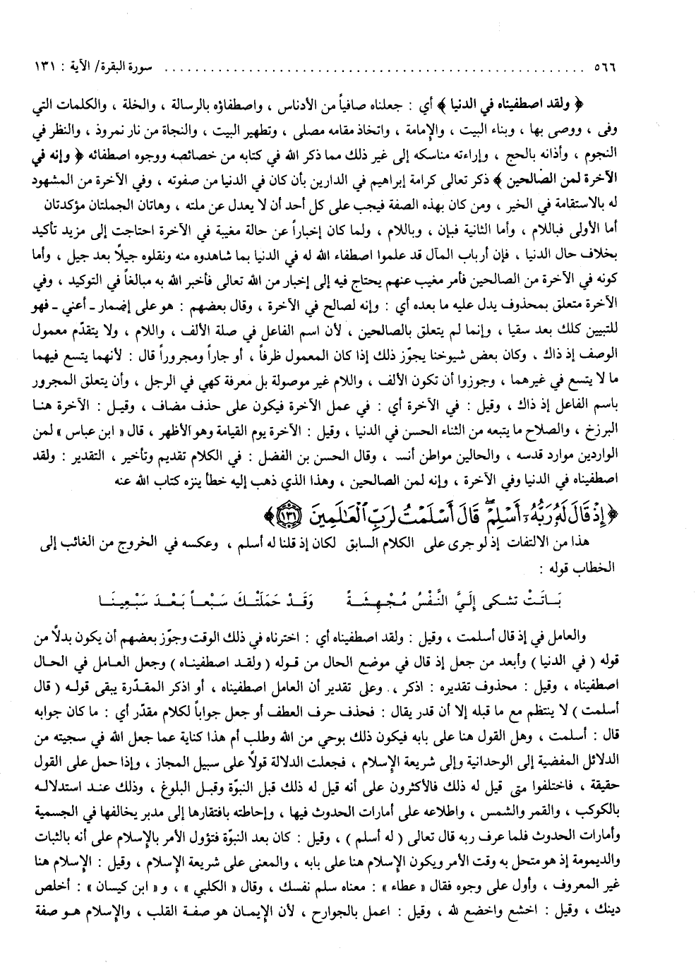 ) وَلَقَدِ اصْطَفَيْنَاهُ فِي الدُّنْيَا ( : أي جعلناه صافياً من الأدناس ، واصطفاؤه بالرسالة والخلة والكلمات التي وفى ووصى بها ، وبناء البيت ، والإمامة ، واتخاذ مقامه مصلى ، وتطهير البيت ، والنجاة من نار نمروذ ، والنظر في النجوم ، وأذانه بالحج ، وإراءته مناسكه ، إلى غير ذلك مما ذكر الله في كتابه ، من خصائصه ووجوه اصطفائه . ) وَإِنَّهُ فِى الاْخِرَةِ لَمِنَ الصَّالِحِينَ ( : ذكر تعالى كرامة إبراهيم في الدارين ، بأن كان في الدنيا من صفوته ، وفي الآخرة من المشهود له بالاستقامة في الخير ، ومن كان بهذه الصفة فيجب على كل أحد أن لا يعدل عن ملته . وهاتان الجملتان مؤكدتان ، أما الأولى فباللام ، وأما الثانية فبأن وباللام . ولما كان إخباراً عن حالة مغيبة في الآخرة ، احتاجت إلى مزيد تأكيد ، بخلاف حال الدنيا ، فإن أرباب المآل قد علموا اصطفاء الله له في الدنيا بما شاهدوه منه ونقلوه جيلاً بعد جيل . وأما كونه في الآخرة من الصالحين ، فأمر مغيب عنهم يحتاج فيه إلى إخبار من الله تعالى ، فأخبر الله به مبالغاً في التوكيد ، وفي الآخرة متعلق بمحذوف يدل عليه ما بعده ، أي وأنه لصالح في الآخرة . وقال بعضهم : هو على إضمار ، أعني : فهو للتبيين ، كلك بعد سقيا ، وإنما لم يتعلق بالصالحين ، لأن اسم الفاعل في صلة الألف واللام ، ولا يتقدّم معمول الوصف إذ ذاك . وكان بعض شيوخنا يجوّز ذلك ، إذا كان المعمول ظرفاً أو جاراً ومجروراً ، قال : لأنهما يتسع فيهما ما لا يتسع في غيرهما . وجوزوا أن تكون الألف واللام غير موصولة ، بل معرفة ، كهي في الرجل ، وأن يتعلق المجرور باسم الفاعل إذ ذاك . وقيل : في الآخرة ، أي في عمل الآخرة ، فيكون على حذف مضاف ، وقيل : الآخرة هنا البرزخ ، والصلاح ما يتبعه من الثناء الحسن في الدنيا . وقيل : الآخرة يوم القيامة ، وهو الأظهر . قال ابن عباس : لمن الصالحين ، أي الأنبياء . وقيل : من الذين يستوجبون صالح الجزاء ، قال معناه الحسن . وقيل : الوارد بن موارد قدسه ، والحالين مواطن أنسه . وقال الحسن بن الفضل : في الكلام تقديم وتأخير ، التقدير ، ولقد اصطفيناه في الدنيا ، وفي الآخرة ، وأنه لمن الصالحين . وهذا الذي ذهب إليه خطأ ينزه كتاب الله عنه .