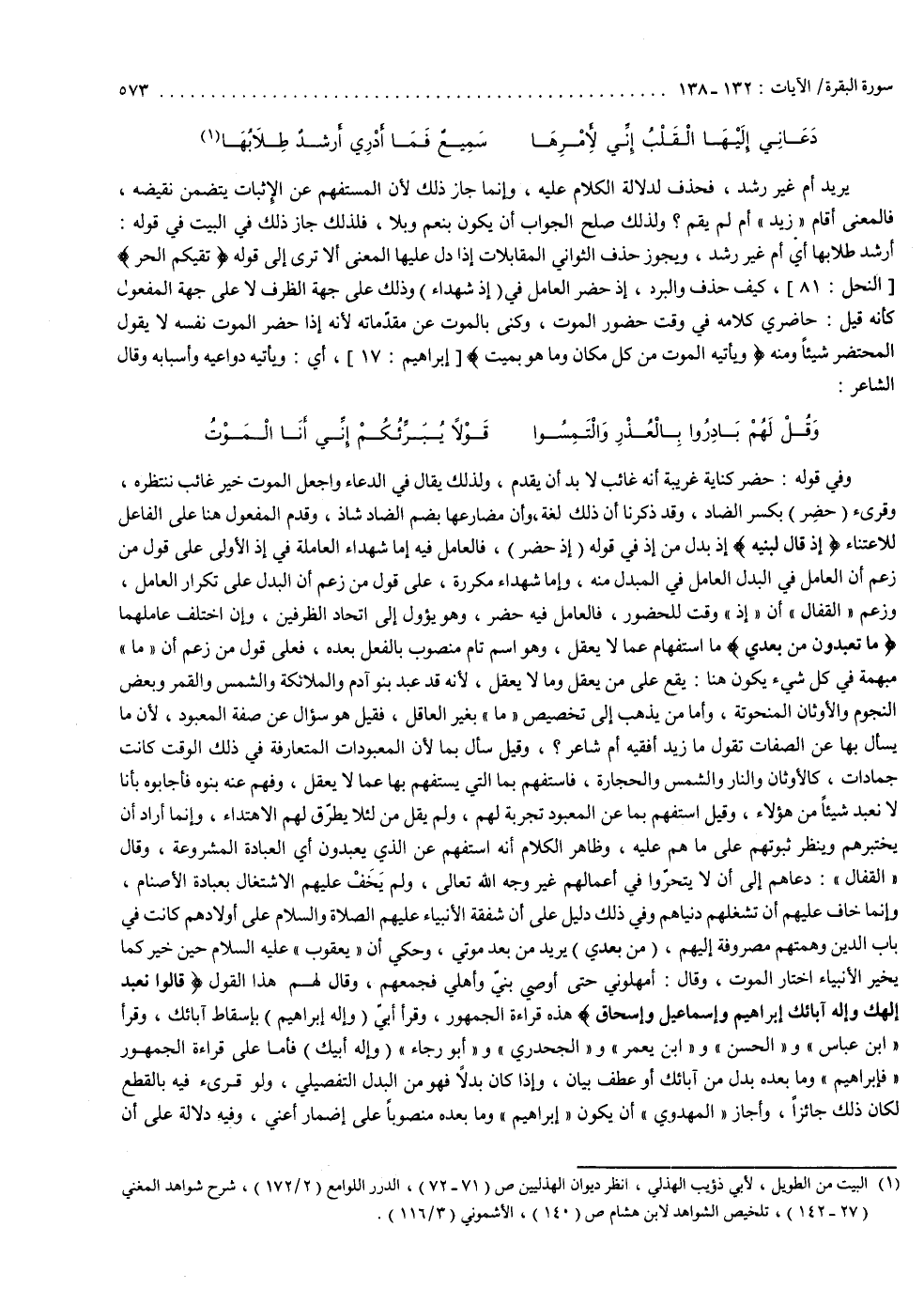 يريد : أم غير رشد ، فحذف لدلالة الكلام عليه ، وإنما جاز ذلك لأن المستفهم عن الإثبات يتضمن نقيضه . فالمعنى : أقام زيد أم لم يقم ، ولذلك صلح الجواب أن يكون بنعم وبلا ، فلذلك جاز ذلك في البيت في قوله : أرشد طلابها ، أي أم غير رشد . ويجوز حذف الثواني المقابلات إذ دل عليها المعنى . ألا ترى إلى قوله : ) تَقِيكُمُ الْحَرَّ ( ، كيف حذف والبرد ؟ إذ حضر العامل في إذ شهداء ، وذلك على جهة الظرف ، لا على جهة المفعول ، كأنه قيل : حاضري كلامه في وقت حضور الموت ، وكنى بالموت عن مقدّماته لأنه إذا حضر الموت نفسه لا يقول المحتضر شيئاً ، ومنه : ) وَيَأْتِيهِ الْمَوْتُ مِن كُلّ مَكَانٍ وَمَا هُوَ بِمَيّتٍ ( ، أي ويأتيه دواعيه وأسبابه ، وقال الشاعر : وقل لهم بادروا العذر والتمسوا