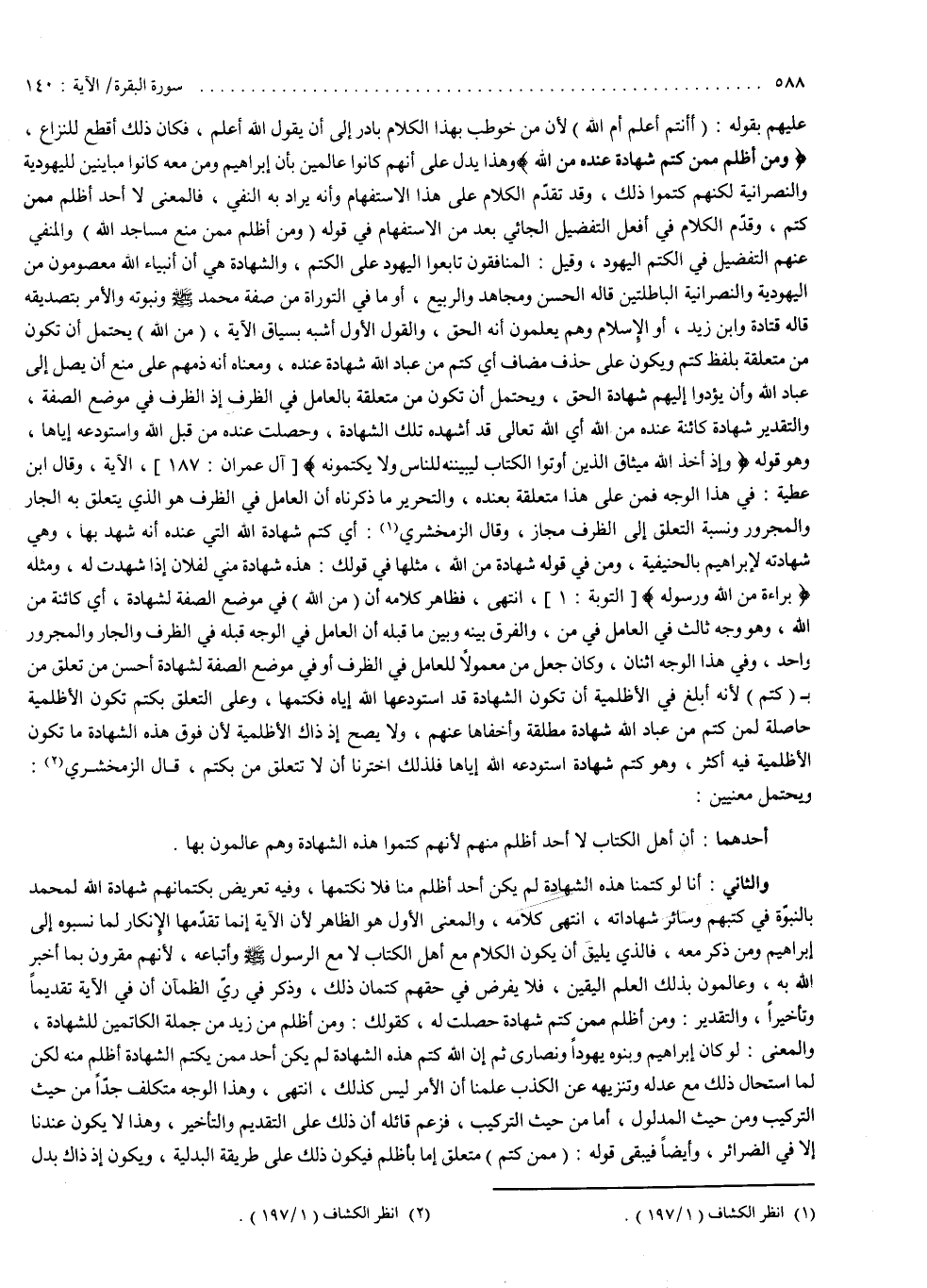 وذكر في ( ريّ الظمآن ) : أي في الآية تقديماً وتأخيراً ، والتقدير : ومن أظلم ممن كتم شهادة حصلت له ؟ كقولك : ومن أظلم من زيد ؟ من جملة الكاتمين للشهادة . والمعنى : لو كان إبراهيم وبنوه يهوداً ونصارى . ثم إن الله كتم هذه الشهادة ، لم يكن أحد ممن يكتم الشهادة أظلم منه ، لكن لما استحال ذلك مع عدله وتنزيهه عن الكذب ، علمنا أن الأمر ليس كذلك . انتهى . وهذا الوجه متكلف جدًّا من حيث التركيب ، ومن حيث المدلول . أما من حيث التركيب ، فزعم قائله أن ذلك على التقديم والتأخير ، وهذا لا يكون عندنا إلا في الضرائر . وأيضاً ، فيبقى قوله : ممن كتم ، متعلق : إما بأظلم ، فيكون ذلك على طريقة البدلية ، ويكون إذ ذاك بدل
