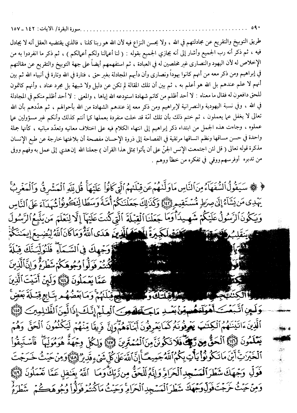 ض 2 ( ) سَيَقُولُ السُّفَهَآءُ مِنَ النَّاسِ مَا وَلَّاهُمْ عَن قِبْلَتِهِمُ الَّتِى كَانُواْ عَلَيْهَا قُل لّلَّهِ الْمَشْرِقُ وَالْمَغْرِبُ يَهْدِى مَن يَشَآءُ إِلَى صِرَاطٍ مُّسْتَقِيمٍ وَكَذَالِكَ جَعَلْنَاكُمْ أُمَّةً وَسَطًا لِّتَكُونُواْ شُهَدَآءَ عَلَى النَّاسِ وَيَكُونَ الرَّسُولُ عَلَيْكُمْ شَهِيدًا وَمَا جَعَلْنَا الْقِبْلَةَ الَّتِى كُنتَ عَلَيْهَآ إِلاَّ لِنَعْلَمَ مَن يَتَّبِعُ الرَّسُولَ مِمَّن يَنقَلِبُ عَلَى عَقِبَيْهِ وَإِن كَانَتْ لَكَبِيرَةً إِلاَّ عَلَى الَّذِينَ هَدَى اللَّهُ وَمَا كَانَ اللَّهُ لِيُضِيعَ إِيمَانَكُمْ إِنَّ اللَّهَ بِالنَّاسِ لَرَءُوفٌ رَّحِيمٌ قَدْ نَرَى تَقَلُّبَ وَجْهِكَ فِي السَّمَآءِ فَلَنُوَلِّيَنَّكَ قِبْلَةً تَرْضَاهَا فَوَلِّ وَجْهَكَ شَطْرَ الْمَسْجِدِ الْحَرَامِ وَحَيْثُ مَا كُنتُمْ فَوَلُّواْ وُجُوهَكُمْ شَطْرَهُ وَإِنَّ الَّذِينَ أُوتُواْ الْكِتَابَ لَيَعْلَمُونَ أَنَّهُ الْحَقُّ مِن رَّبِّهِمْ وَمَا اللَّهُ بِغَافِلٍ عَمَّا يَعْمَلُونَ وَلَئِنْ أَتَيْتَ الَّذِينَ أُوتُواْ الْكِتَابَ بِكُلِّ ءَايَةٍ مَّا تَبِعُواْ قِبْلَتَكَ وَمَآ أَنتَ بِتَابِعٍ قِبْلَتَهُمْ وَمَا بَعْضُهُم بِتَابِعٍ قِبْلَةَ بَعْضٍ وَلَئِنِ اتَّبَعْتَ أَهْوَآءَهُم مِّن بَعْدِ مَا جَآءَكَ مِنَ الْعِلْمِ إِنَّكَ إِذَا لَّمِنَ الظَّالِمِينَ الَّذِينَ آتَيْنَاهُمُ الْكِتَابَ يَعْرِفُونَهُ كَمَا يَعْرِفُونَ أَبْنَآءَهُمْ وَإِنَّ فَرِيقًا مِّنْهُمْ لَيَكْتُمُونَ الْحَقَّ وَهُمْ يَعْلَمُونَ الْحَقُّ مِن رَّبِّكَ فَلاَ تَكُونَنَّ مِنَ الْمُمْتَرِينَ وَلِكُلٍّ وِجْهَةٌ هُوَ مُوَلِّيهَا فَاسْتَبِقُواْ الْخَيْرَاتِ أَيْنَ مَا تَكُونُواْ يَأْتِ بِكُمُ اللَّهُ جَمِيعًا إِنَّ اللَّهَ عَلَى كُلِّ شَىْءٍ قَدِيرٌ وَمِنْ حَيْثُ خَرَجْتَ فَوَلِّ وَجْهَكَ شَطْرَ الْمَسْجِدِ الْحَرَامِ وَإِنَّهُ لَلْحَقُّ مِن رَّبِّكَ وَمَا اللَّهُ بِغَافِلٍ عَمَّا تَعْمَلُونَ وَمِنْ حَيْثُ خَرَجْتَ فَوَلِّ وَجْهَكَ شَطْرَ الْمَسْجِدِ الْحَرَامِ وَحَيْثُ مَا كُنتُمْ فَوَلُّواْ وُجُوهَكُمْ شَطْرَه
