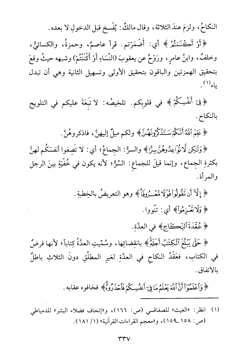 {أَوْ أَكْنَنْتُمْ} أي: أَضْمَرْتم. قرأ عاصمٌ، وحمزةُ، والكسائيُّ، وخلفٌ، وابنُ عامرٍ، ورَوْحٌ عن يعقوبَ (النِّسَاءِ أَوْ أَكْنَنْتُمْ) وشبهه حيثُ وقعَ بتحقيق الهمزتين والباقون بتحقيق الأولى وتسهيل الثانية وهي أن تبدل ياء (¬1).