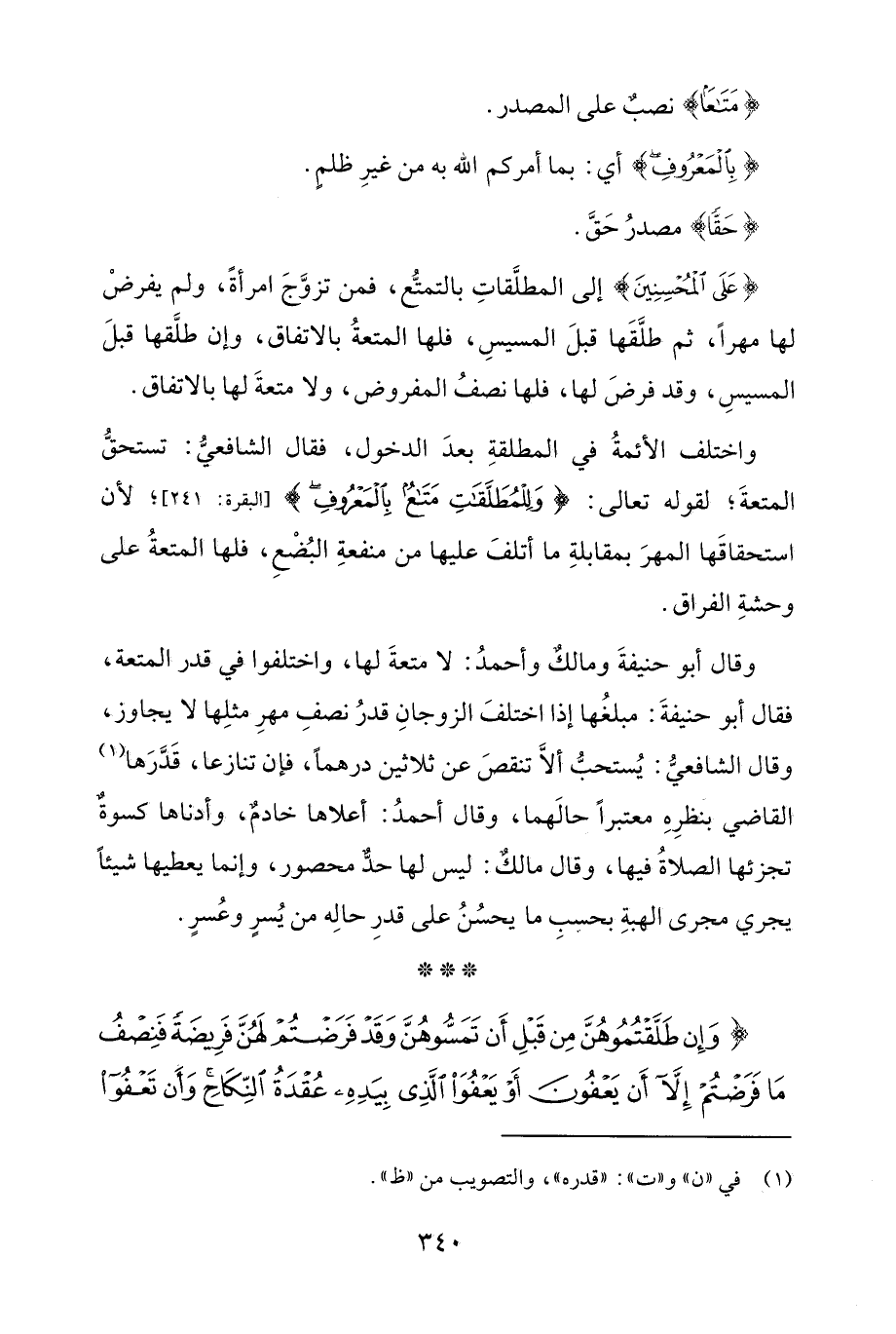 {عَلَى الْمُحْسِنِينَ} إلى المطلَّقاتِ بالتمتُّع، فمن تزوَّجَ امرأةً، ولم يفرضْ لها مهرًا، ثم طلَّقَها قبلَ المسيسِ، فلها المتعةُ بالاتفاق، وإن طلَّقها قبلَ المسيسِ، وقد فرضَ لها، فلها نصفُ المفروض، ولا متعةَ لها بالاتفاق.