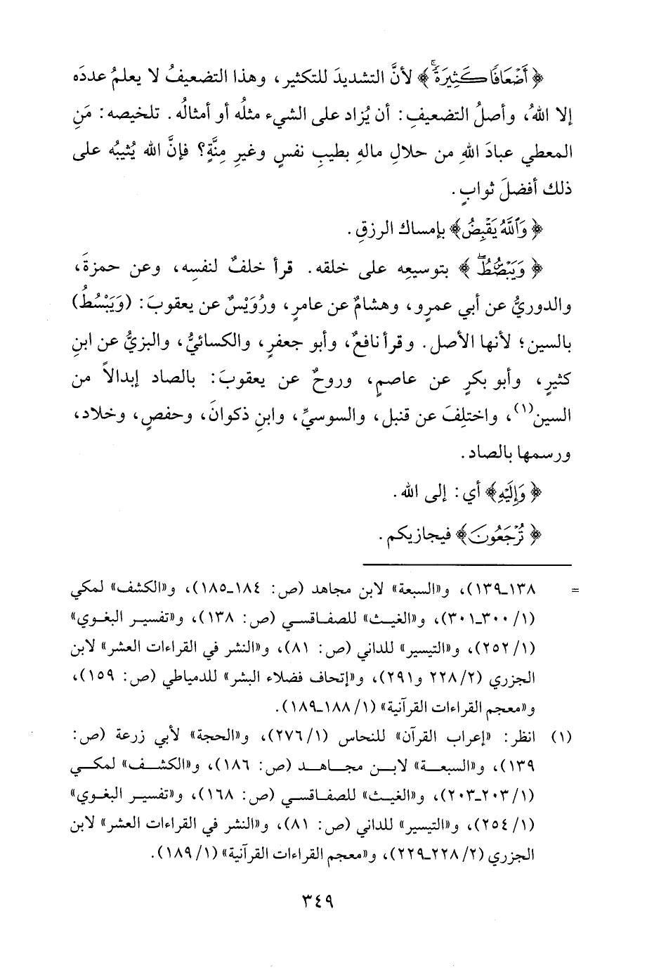 (¬1) انظر: "إعراب القرآن" للنحاس (1/ 276)، و"الحجة" لأبي زرعة (ص: 139)، و"السبعة" لابن مجاهد (ص: 186)، و"الكشف" لمكي (1/ 203 - 203)، و"الغيث" للصفاقسي (ص: 168)، و"تفسير البغوي" (1/ 254)، و"التيسير" للداني (ص: 81)، و"النشر في القراءات العشر" لابن الجزري (2/ 228 - 229)، و"معجم القراءات القرآنية" (1/ 189).