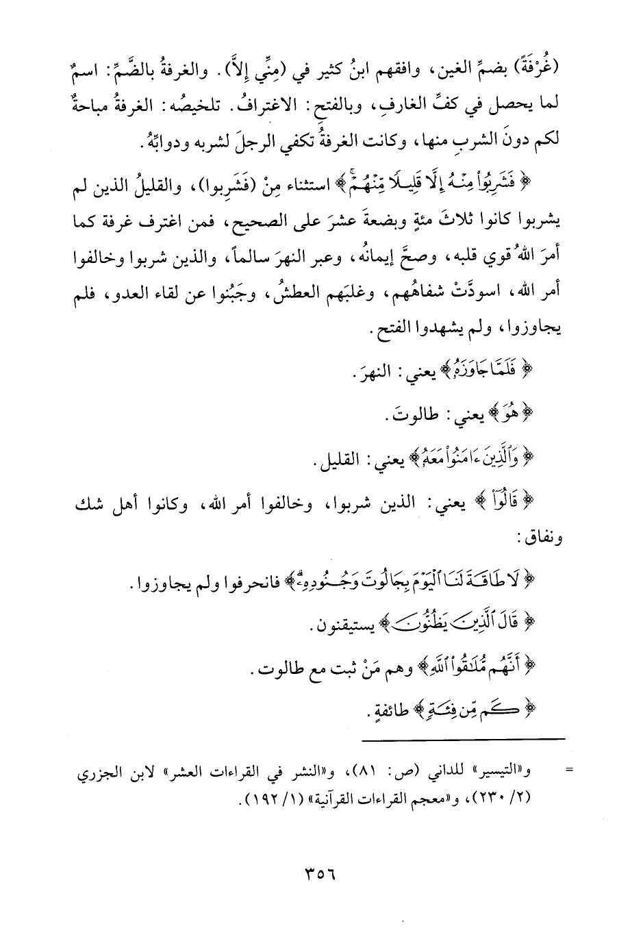 (غُرْفَةً) بضمِّ الغين، وافقهم ابنُ كثير في (مِنِّي إِلَّا). والغرفةُ بالضمِّ: اسمٌ لما يحصل في كفِّ الغارفِ، وبالفتحِ: الاغترافُ. تلخيصُه: الغرفةُ مباحةٌ لكم دونَ الشربِ منها، وكانت الغرفةُ تكفي الرجلَ لشربه ودوابِّهُ.
