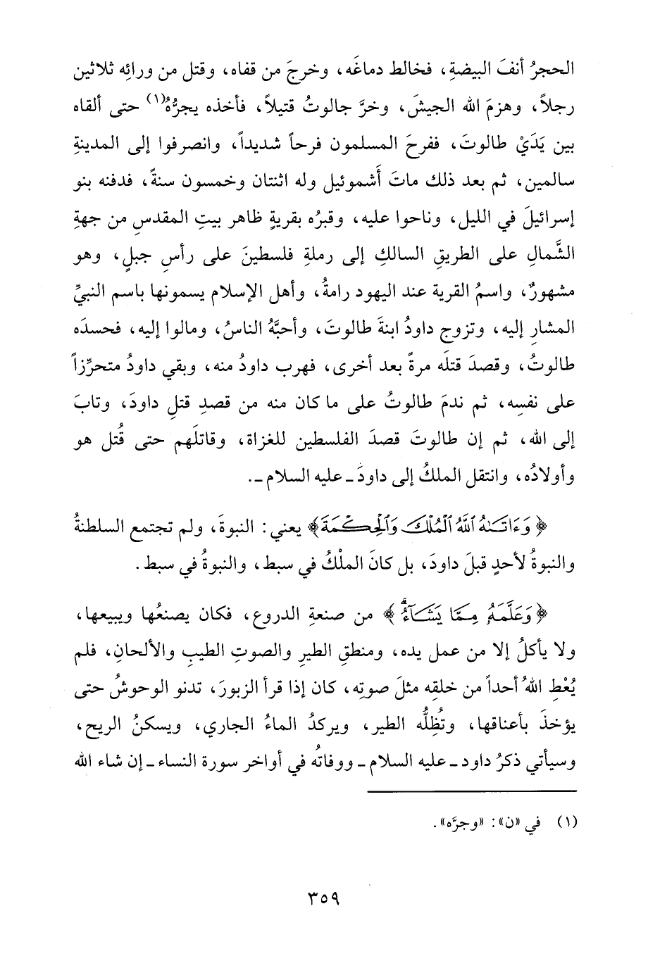 الحجرُ أنفَ البيضةِ، فخالط دماغَه، وخرجَ من قفاه، وقتل من ورائِه ثلاثين رجلًا، وهزمَ الله الجيشَ، وخرَّ جالوتُ قتيلًا، فأخذه يجرُّهُ (¬1) حتى ألقاه بين يَدَيْ طالوتَ، ففرحَ المسلمون فرحًا شديدًا، وانصرفوا إلى المدينةِ سالمين، ثم بعد ذلك ماتَ أَشموئيل وله اثنتان وخمسون سنةً، فدفنه بنو إسرائيلَ في الليل، وناحوا عليه، وقبرُه بقريةٍ ظاهر بيتِ المقدسِ من جهةِ الشَّمالِ على الطريقِ السالكِ إلى رملةِ فلسطينَ على رأسِ جبلٍ، وهو مشهورٌ، واسمُ القرية عند اليهود رامةُ، وأهل الإسلام يسمونها باسم النبيِّ المشارِ إليه، وتزوج داودُ ابنةَ طالوتَ، وأحبَّهُ الناسُ، ومالوا إليه، فحسدَه طالوتُ، وقصدَ قتلَه مرةً بعد أخرى، فهرب داودُ منه، وبقي داودُ متحرِّزًا على نفسِه، ثم ندمَ طالوتُ على ما كان منه من قصدِ قتلِ داودَ، وتابَ إلى الله، ثم إن طالوتَ قصدَ الفلسطين للغزاة، وقاتلَهم حتى قُتل هو وأولادُه، وانتقل الملكُ إلى داودَ -عليه السلام-.