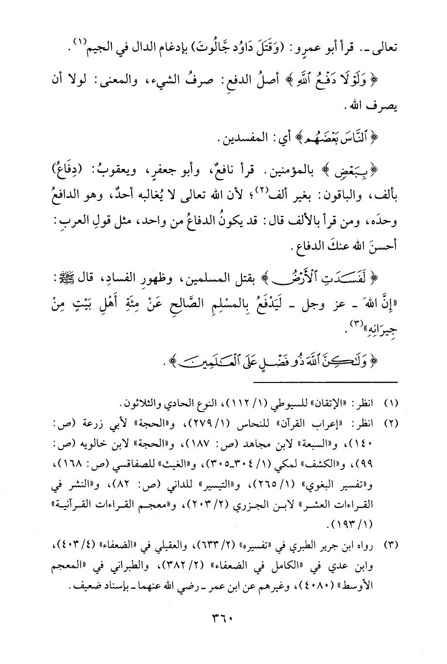 {بِبَعْضٍ} بالمؤمنين. قرأ نافعٌ، وأبو جعفرٍ، ويعقوبُ: (دِفَاعُ) بألف، والباقون: بغير ألف (¬2)؛ لأن الله تعالى لا يُغالبه أحدٌ، وهو الدافعُ وحدَه، ومن قرأ بالألف قال: قد يكونُ الدفاعُ من واحد، مثل قولِ العربِ: أحسنَ الله عنكَ الدفاع.