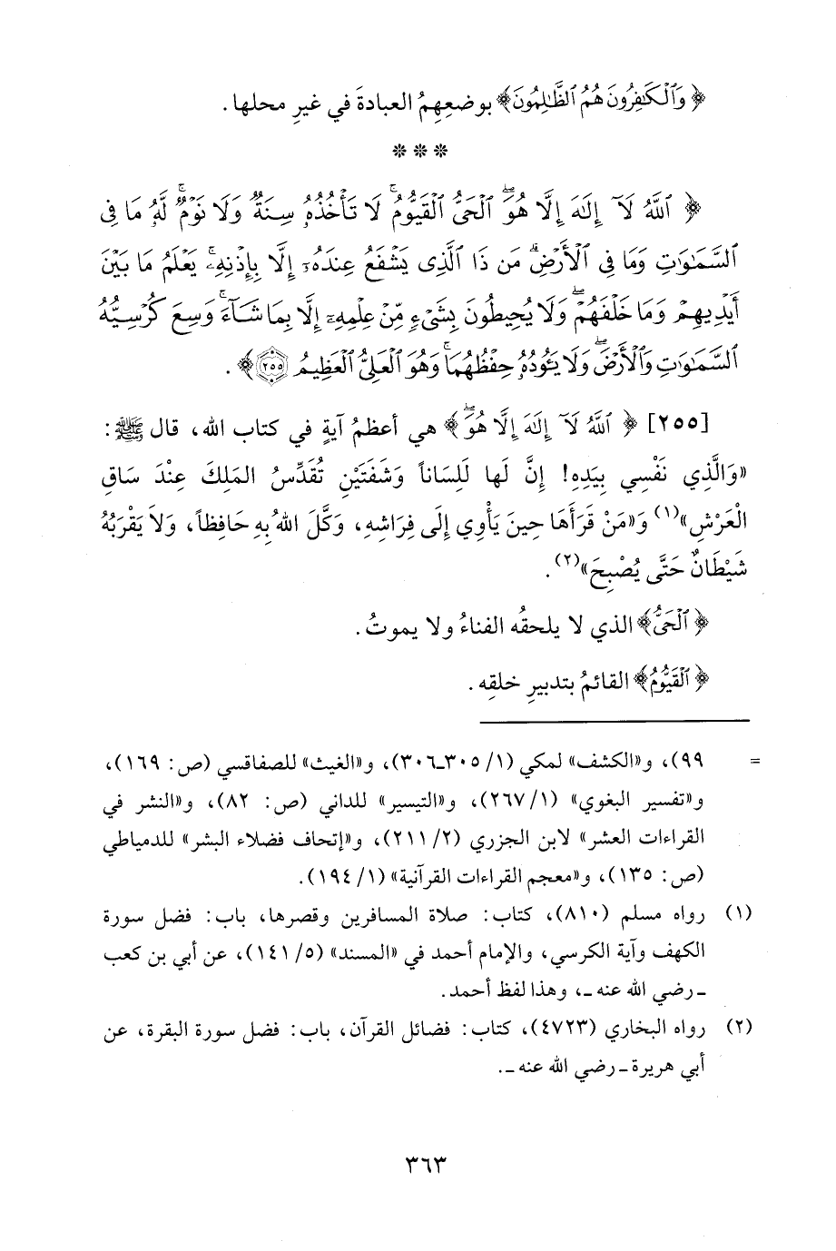 [255] {اللَّهُ لَا إِلَهَ إِلَّا هُوَ} هي أعظمُ آيةٍ في كتاب الله، قال - صلى الله عليه وسلم -: "وَالَّذِي نَفْسِي بِيَدِهِ! إِنَّ لَها لَلِسَانًا وَشَفَتَيْنِ تُقَدِّسُ المَلِكَ عِنْدَ سَاقِ الْعَرْشِ" (¬1) وَ"مَنْ قَرَأَهَا حِينَ يَأْوِي إِلَى فِرَاشِهِ، وَكَّلَ اللهُ بِهِ حَافِظًا، وَلاَ يَقْرَبُهُ شَيْطَانٌ حَتَّى يُصْبِحَ" (¬2).