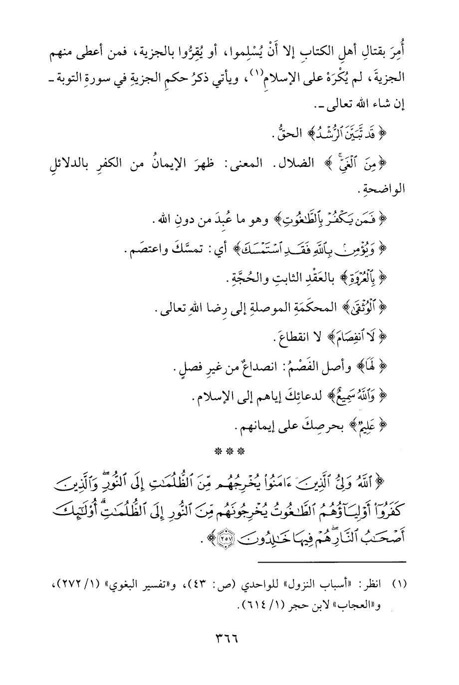 أُمِرَ بقتالِ أهلِ الكتابِ إلا أَنْ يُسْلِموا، أو يُقِرُّوا بالجزية، فمن أعطى منهم الجزيةَ، لم يُكْرَهْ على الإسلامِ (¬1)، ويأتي ذكرُ حكمِ الجزيةِ في سورةِ التوبة -إن شاء الله تعالى-.