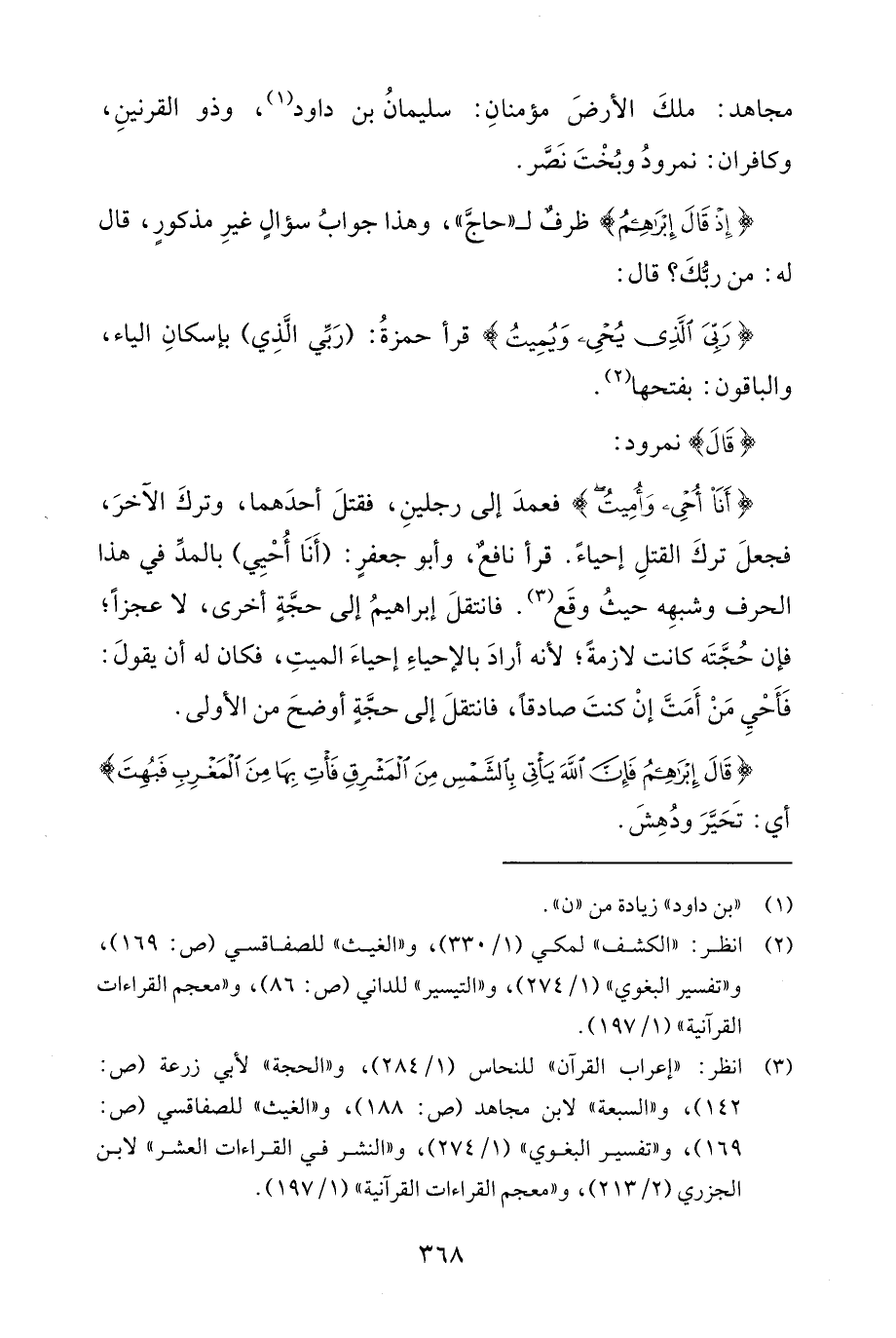 {أَنَا أُحْيِي وَأُمِيتُ} فعمدَ إلى رجلينِ، فقتلَ أحدَهما، وتركَ الآخرَ، فجعلَ تركَ القتلِ إحياءً. قرأ نافعٌ، وأبو جعفرٍ: (أَنَا أُحْيِي) بالمدِّ في هذا الحرف وشبهِه حيثُ وقَع (¬3). فانتقلَ إبراهيمُ إلى حجَّةٍ أخرى، لا عجزًا؛ فإن حُجَّتَه كانت لازمة؛ لأنه أرادَ بالإحياءِ إحياءَ الميتِ، فكان له أن يقولَ: فَأَحْيِ مَنْ أَمَتَّ إنْ كنتَ صادقًا، فانتقلَ إلى حجَّةٍ أوضحَ من الأولى.