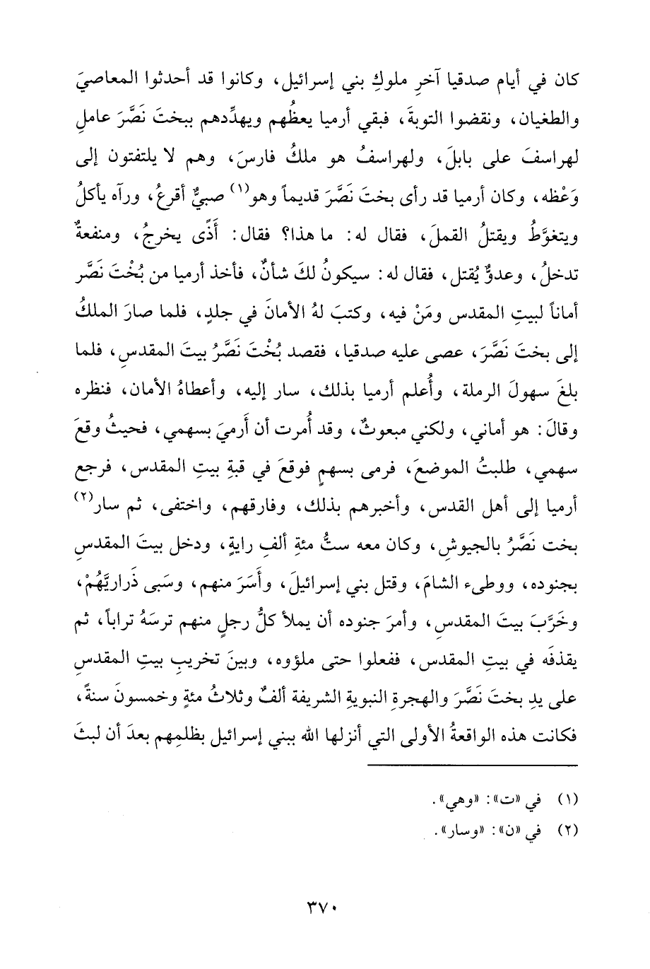 كان في أيام صدقيا آخرِ ملوكِ بني إسرائيل، وكانوا قد أحدثوا المعاصيَ والطغيان، ونقضوا التوبةَ، فبقي أرميا يعظُهم ويهدِّدهم ببختَ نَصَّرَ عاملِ لهراسفَ على بابلَ، ولهراسفُ هو ملكُ فارسَ، وهم لا يلتفتون إلى وَعْظه، وكان أرميا قد رأى بختَ نَصَّرَ قديمًا وهو (¬1) صبيٌّ أقرعُ، ورآه يأكلُ ويتغوَّطُ ويقتلُ القملَ، فقال له: ما هذا؟ فقال: أَذًى يخرجُ، ومنفعةٌ تدخلُ، وعدوٌّ يُقتل، فقال له: سيكونُ لكَ شأنٌ، فأخذ أرميا من بُخْتَ نَصَّر أمانًا لبيتِ المقدس ومَنْ فيه، وكتبَ لهُ الأمانَ في جلدٍ، فلما صارَ الملكُ إلى بختَ نَصَّرَ، عصى عليه صدقيا، فقصد بُخْتَ نَصَّرُ بيتَ المقدسِ، فلما بلغَ سهولَ الرملة، وأُعلم أرميا بذلك، سار إليه، وأعطاهُ الأمان، فنظره وقالَ: هو أماني، ولكني مبعوثٌ، وقد أُمرت أن أَرميَ بسهمي، فحيثُ وقعَ سهمي، طلبتُ الموضعَ، فرمى بسهمٍ فوقعَ في قبةِ بيتِ المقدس، فرجع أرميا إلى أهل القدس، وأخبرهم بذلك، وفارقهم، واختفى، ثم سار (¬2) بخت نَصَّرُ بالجيوشِ، وكان معه ستُّ مئةِ ألفِ رايةٍ، ودخل بيتَ المقدسِ بجنوده، ووطئ الشامَ، وقتل بني إسرائيلَ، وأَسَرَ منهم، وسَبى ذَراريَّهُمْ، وخَرَّبَ بيتَ المقدسِ، وأمرَ جنوده أن يملأ كلُّ رجلٍ منهم ترسَهُ ترابًا، ثم يقذفَه في بيتِ المقدس، ففعلوا حتى ملؤوه، وبينَ تخريبِ بيتِ المقدسِ على يدِ بختَ نَصَّرَ والهجرةِ النبويةِ الشريفة ألفٌ وثلاثُ مئةٍ وخمسونَ سنةً، فكانت هذه الواقعةُ الأولى التي أنزلها الله ببني إسرائيل بظلمِهم بعدَ أن لبثَ