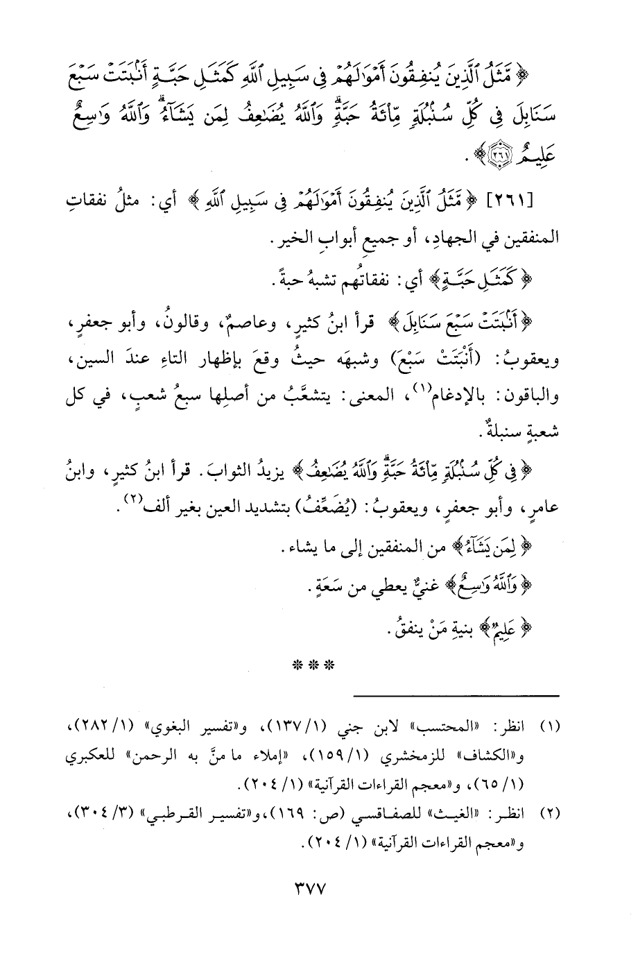 {فِي كُلِّ سُنْبُلَةٍ مِائَةُ حَبَّةٍ وَاللَّهُ يُضَاعِفُ} يزيدُ الثوابَ. قرأ ابنُ كثيرٍ، وابنُ عامرٍ، وأبو جعفرٍ، ويعقوبُ: (يُضَعِّفُ) بتشديد العين بغير ألف (¬2).