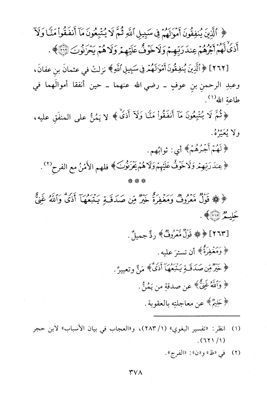 [262] {الَّذِينَ يُنْفِقُونَ أَمْوَالَهُمْ فِي سَبِيلِ اللَّهِ} نزلتْ في عثمانَ بنِ عفانَ، وعبدِ الرحمنِ بنِ عوفٍ -رضي الله عنهما- حين أنفقا أموالَهما في طاعةِ الله (¬1).