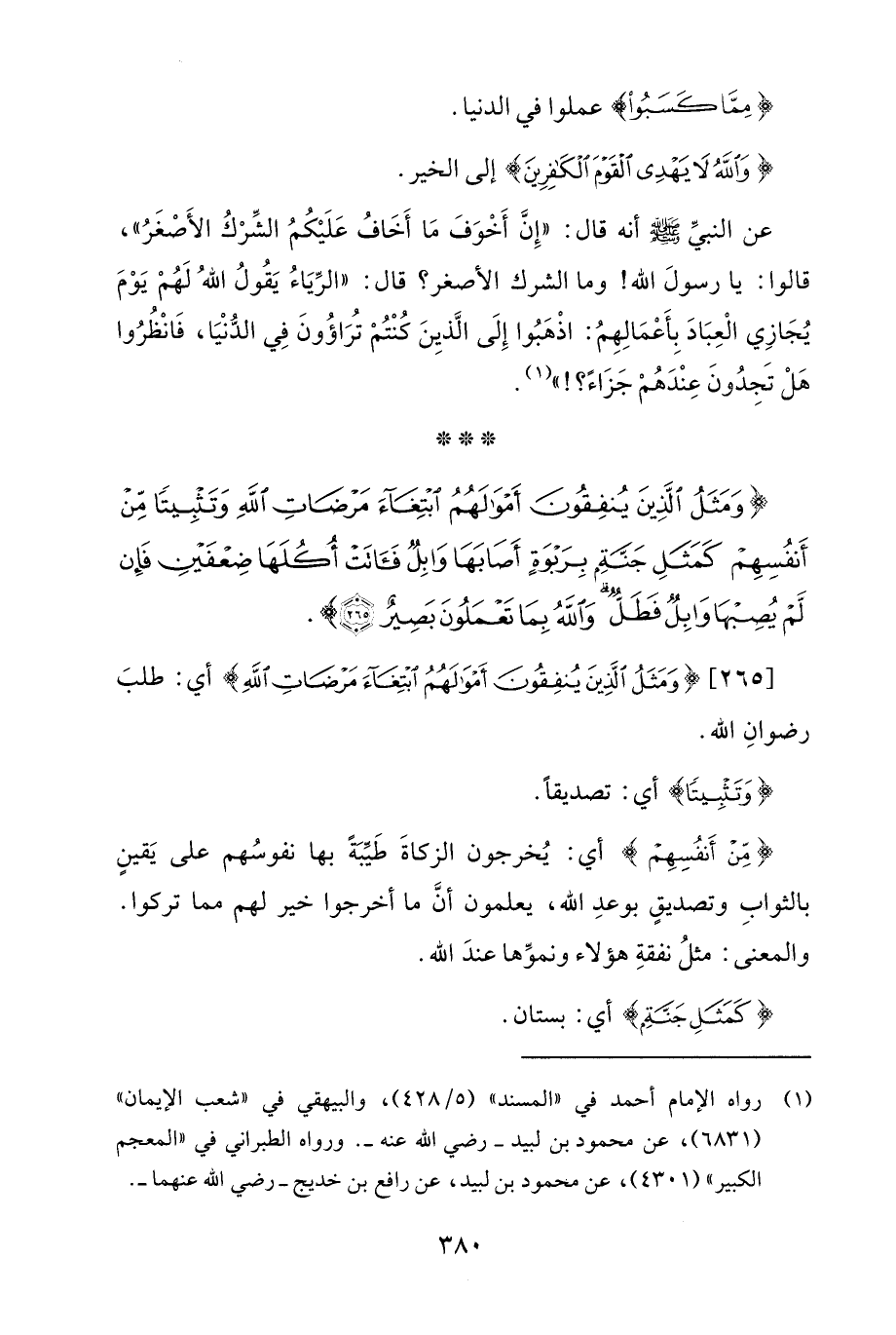 [265] {وَمَثَلُ الَّذِينَ يُنْفِقُونَ أَمْوَالَهُمُ ابْتِغَاءَ مَرْضَاتِ اللَّهِ} أي: طلبَ رضوانِ الله.