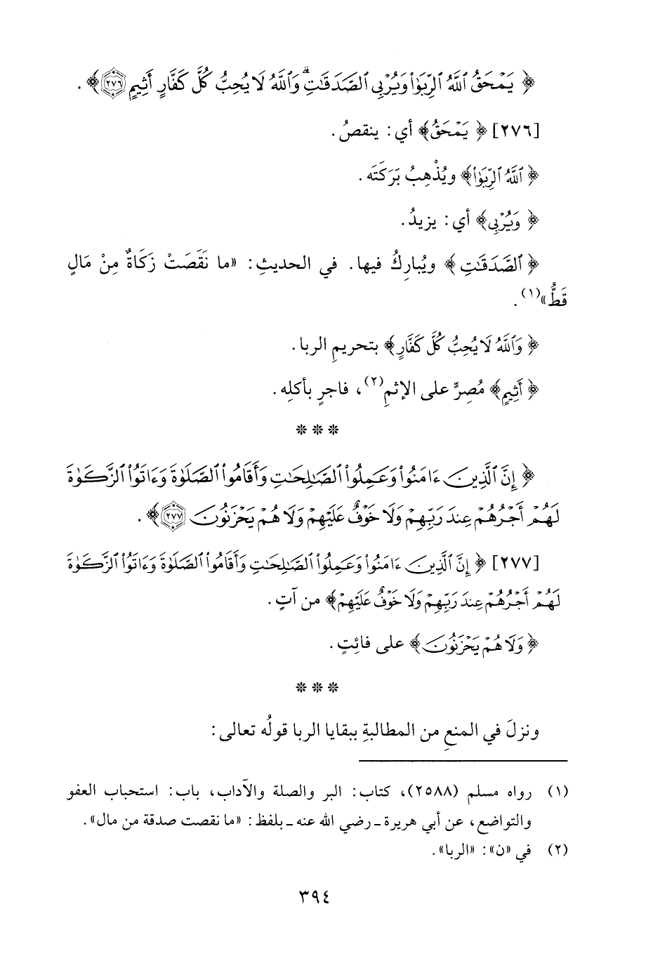 {يَمْحَقُ اللَّهُ الرِّبَا وَيُرْبِي الصَّدَقَاتِ وَاللَّهُ لَا يُحِبُّ كُلَّ كَفَّارٍ أَثِيمٍ (276)}.