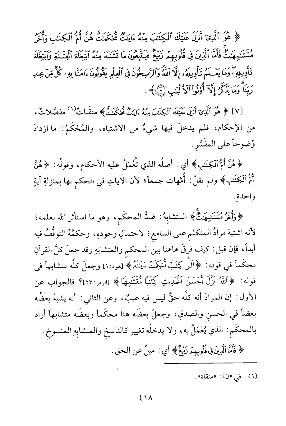 {وَأُخَرُ مُتَشَابِهَاتٌ} المتشابِهُ: ضدُّ المحكَمِ، وهو ما استأثر الله بعلمه؛ لأنه اشتبهَ مرادُ المتكلمِ على السامعِ، لاحتمالِ وجودهِ، وحكمُهُ التوقُّفُ فيه أبدًا، فإن قيل: كيف فرقَ ها هنا بين المحكمِ والمتشابهِ وقد جعلَ كلَّ القرآنِ محكَمًا في قوله: {الر كِتَابٌ أُحْكِمَتْ آيَاتُهُ} [هود: 1] وجعلَ كلَّه متشابهًا في قوله: {اللَّهُ نَزَّلَ أَحْسَنَ الْحَدِيثِ كِتَابًا مُتَشَابِهًا} [الزمر: 23]؟ فالجواب عن الأول: إن المرادَ أنه كلَّه حقٌّ ليس فيه عيبٌ، وعن الثاني: أنه يشبهُ بعضُه بعضًا في الحسنِ والصدقِ، وجعلَ بعضَه هنا محكَمًا وبعضَه متشابهًا أراد بالمحكَمِ: الذي يُعْمَلُ به، ولا يدخلُه تغيير كالناسخِ والمتشابِهِ المنسوخِ.