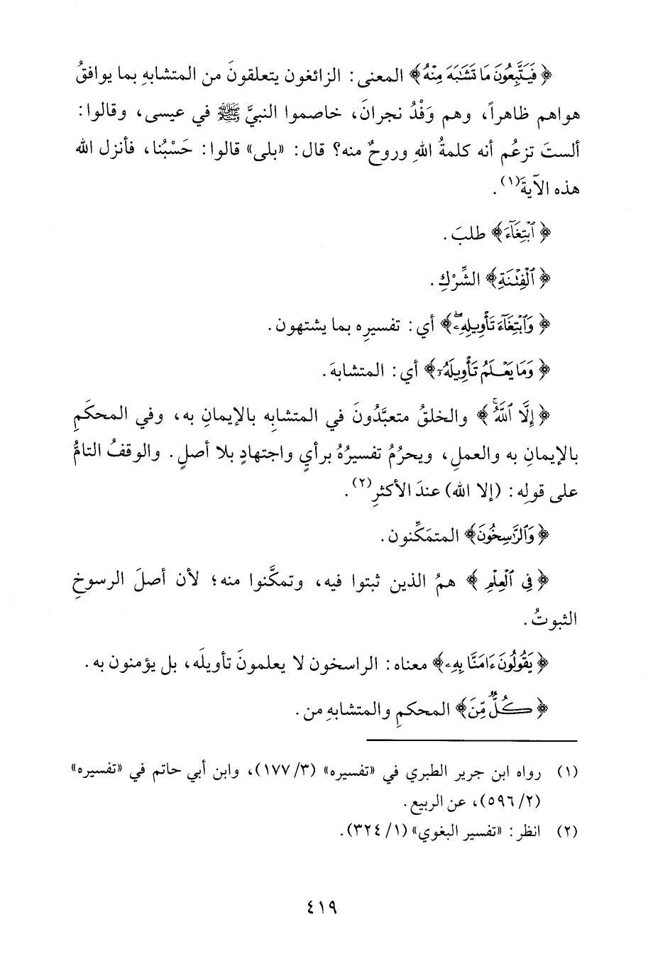 {إِلَّا اللَّهُ} والخلقُ متعبَّدُونَ في المتشابِه بالإيمانِ به، وفي المحكَمِ بالإيمانِ به والعملِ، ويحرُمُ تفسيرُهُ برأيٍ واجتهادٍ بلا أصلٍ. والوقفُ التامُّ على قوله: (إلا الله) عندَ الأكثرِ (¬2).