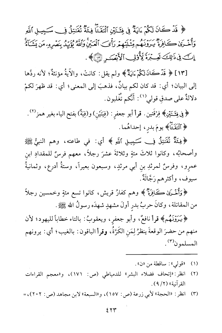 {قَدْ كَانَ لَكُمْ آيَةٌ فِي فِئَتَيْنِ الْتَقَتَا فِئَةٌ تُقَاتِلُ فِي سَبِيلِ اللَّهِ وَأُخْرَى كَافِرَةٌ يَرَوْنَهُمْ مِثْلَيْهِمْ رَأْيَ الْعَيْنِ وَاللَّهُ يُؤَيِّدُ بِنَصْرِهِ مَنْ يَشَاءُ إِنَّ فِي ذَلِكَ لَعِبْرَةً لِأُولِي الْأَبْصَارِ (13)}.