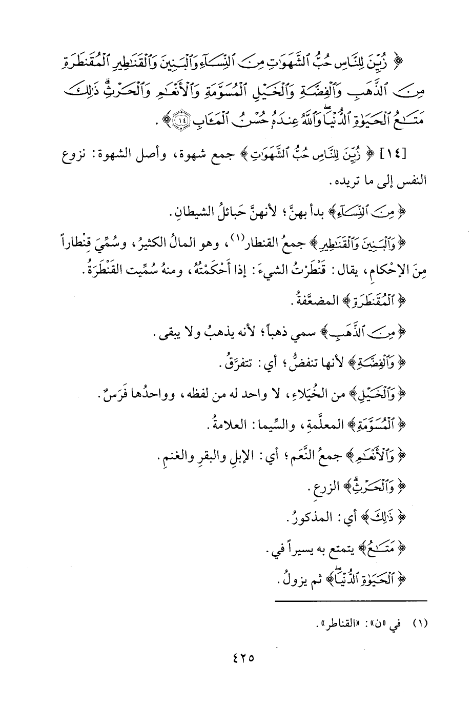 {زُيِّنَ لِلنَّاسِ حُبُّ الشَّهَوَاتِ مِنَ النِّسَاءِ وَالْبَنِينَ وَالْقَنَاطِيرِ الْمُقَنْطَرَةِ مِنَ الذَّهَبِ وَالْفِضَّةِ وَالْخَيْلِ الْمُسَوَّمَةِ وَالْأَنْعَامِ وَالْحَرْثِ ذَلِكَ مَتَاعُ الْحَيَاةِ الدُّنْيَا وَاللَّهُ عِنْدَهُ حُسْنُ الْمَآبِ (14)}.