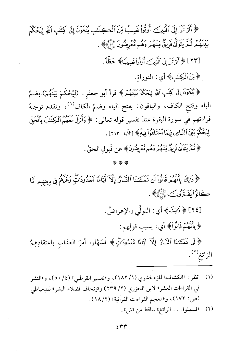 {أَلَمْ تَرَ إِلَى الَّذِينَ أُوتُوا نَصِيبًا مِنَ الْكِتَابِ يُدْعَوْنَ إِلَى كِتَابِ اللَّهِ لِيَحْكُمَ بَيْنَهُمْ ثُمَّ يَتَوَلَّى فَرِيقٌ مِنْهُمْ وَهُمْ مُعْرِضُونَ (23)}.