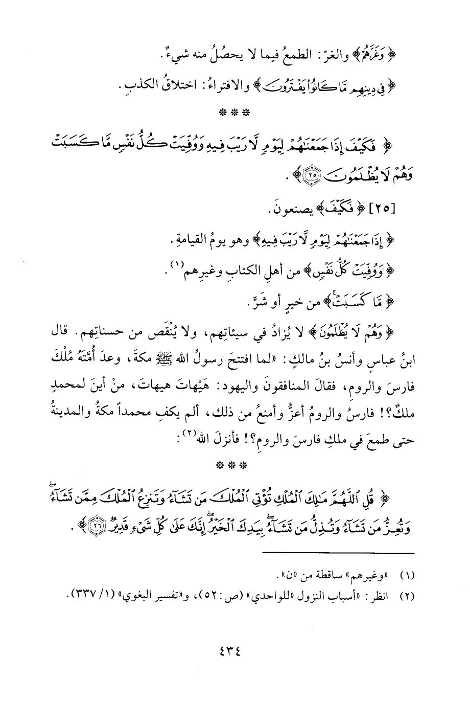 {فَكَيْفَ إِذَا جَمَعْنَاهُمْ لِيَوْمٍ لَا رَيْبَ فِيهِ وَوُفِّيَتْ كُلُّ نَفْسٍ مَا كَسَبَتْ وَهُمْ لَا يُظْلَمُونَ (25)}.