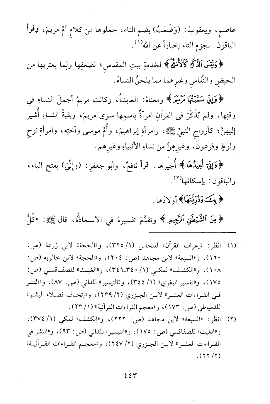 (¬2) انظر: "السبعة" لابن مجاهد (ص: 222)، و"الكشف" لمكي (1/ 374)، و"الغيث" للصفاقسي (ص: 175)، و"التيسير" للداني (ص: 93)، و"النشر في القراءات العشر" لابن الجزري (2/ 247)، و"معجم القراءات القرآنية" (2/ 22).