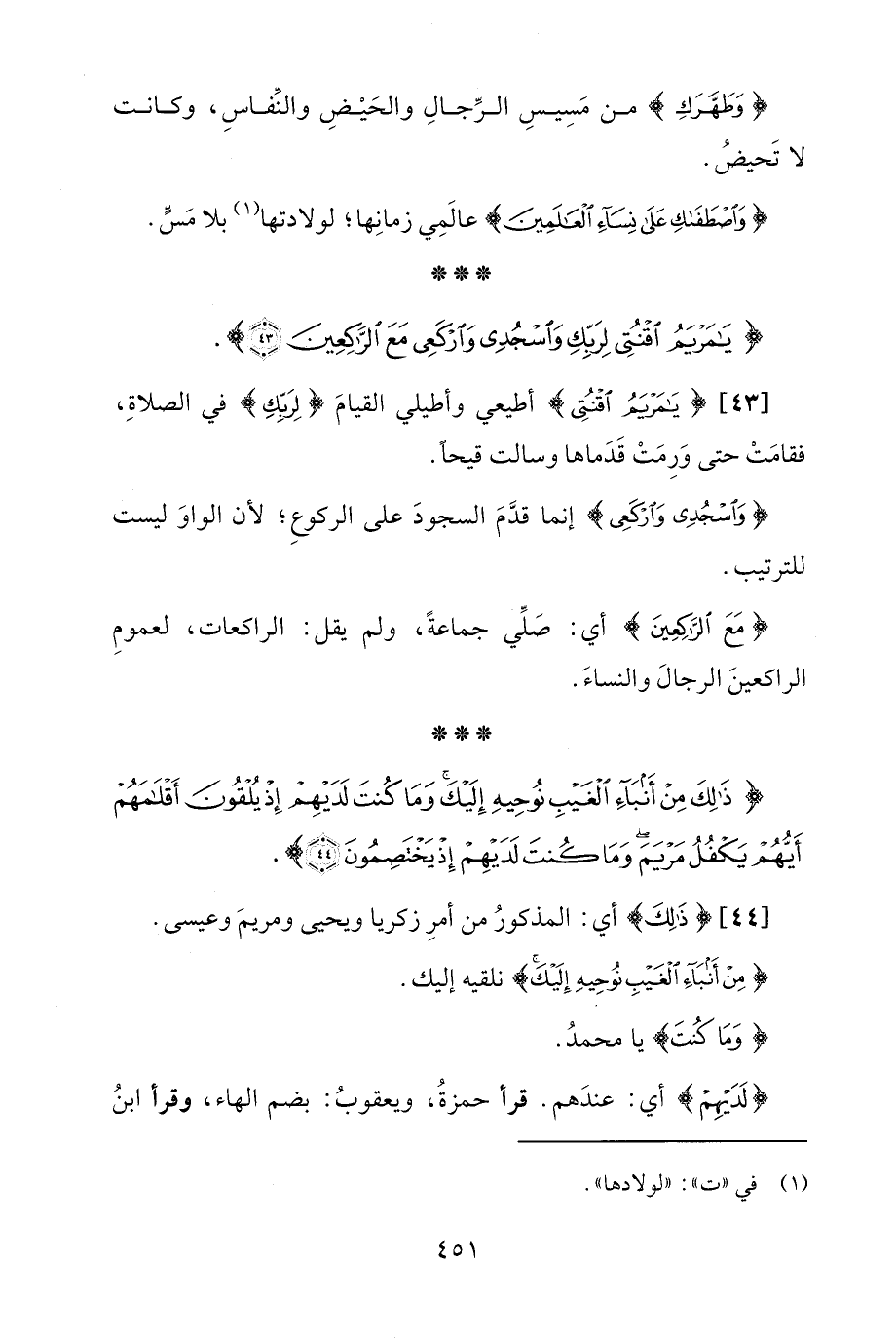 [43] {يَامَرْيَمُ اقْنُتِي} أطيعي وأطيلي القيامَ {لِرَبِّكِ} في الصلاةِ، فقامَتْ حتى وَرِمَتْ قَدَماها وسالت قيحًا.