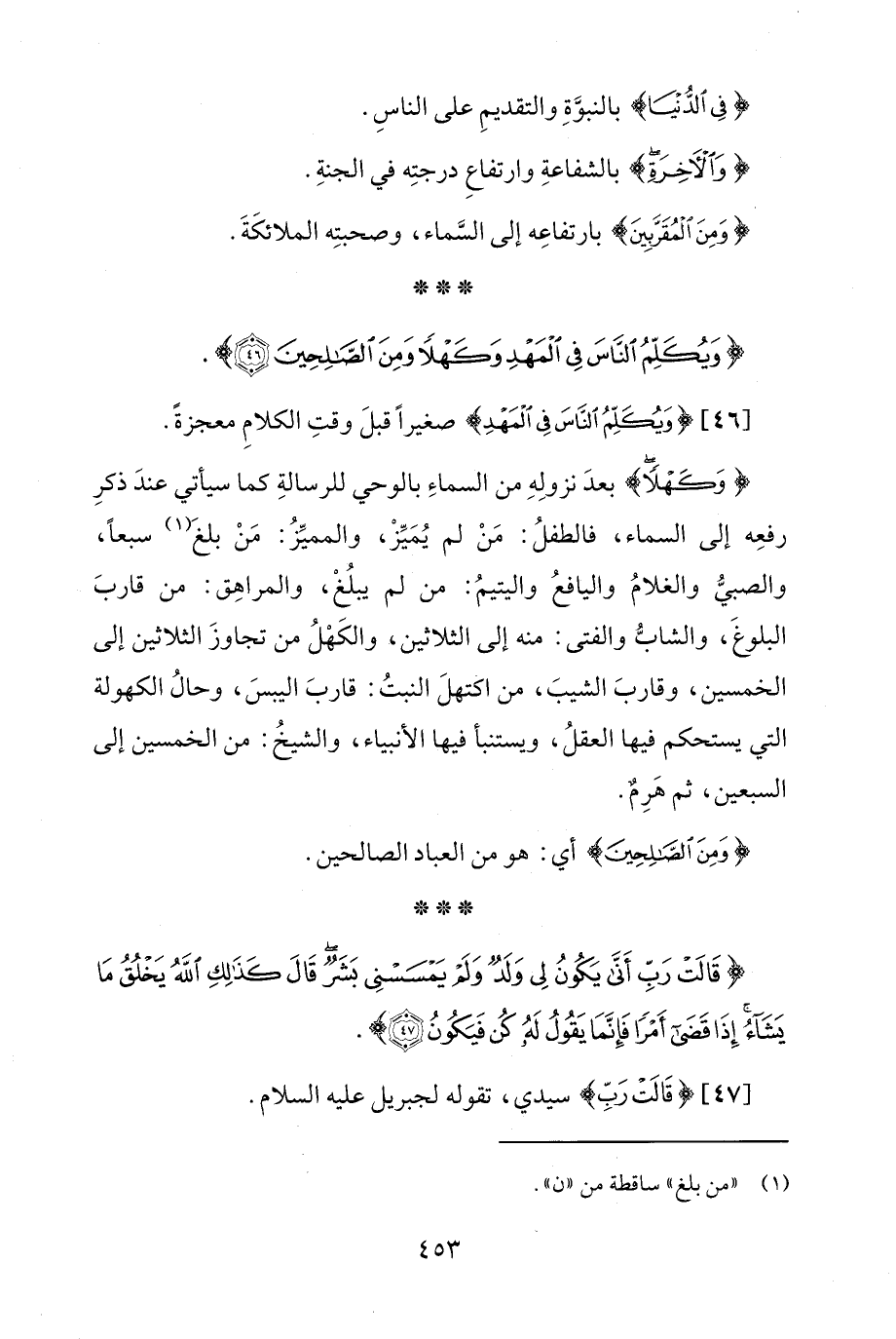 [46] {وَيُكَلِّمُ النَّاسَ فِي الْمَهْدِ} صغيرًا قبلَ وقتِ الكلامِ معجزةً.