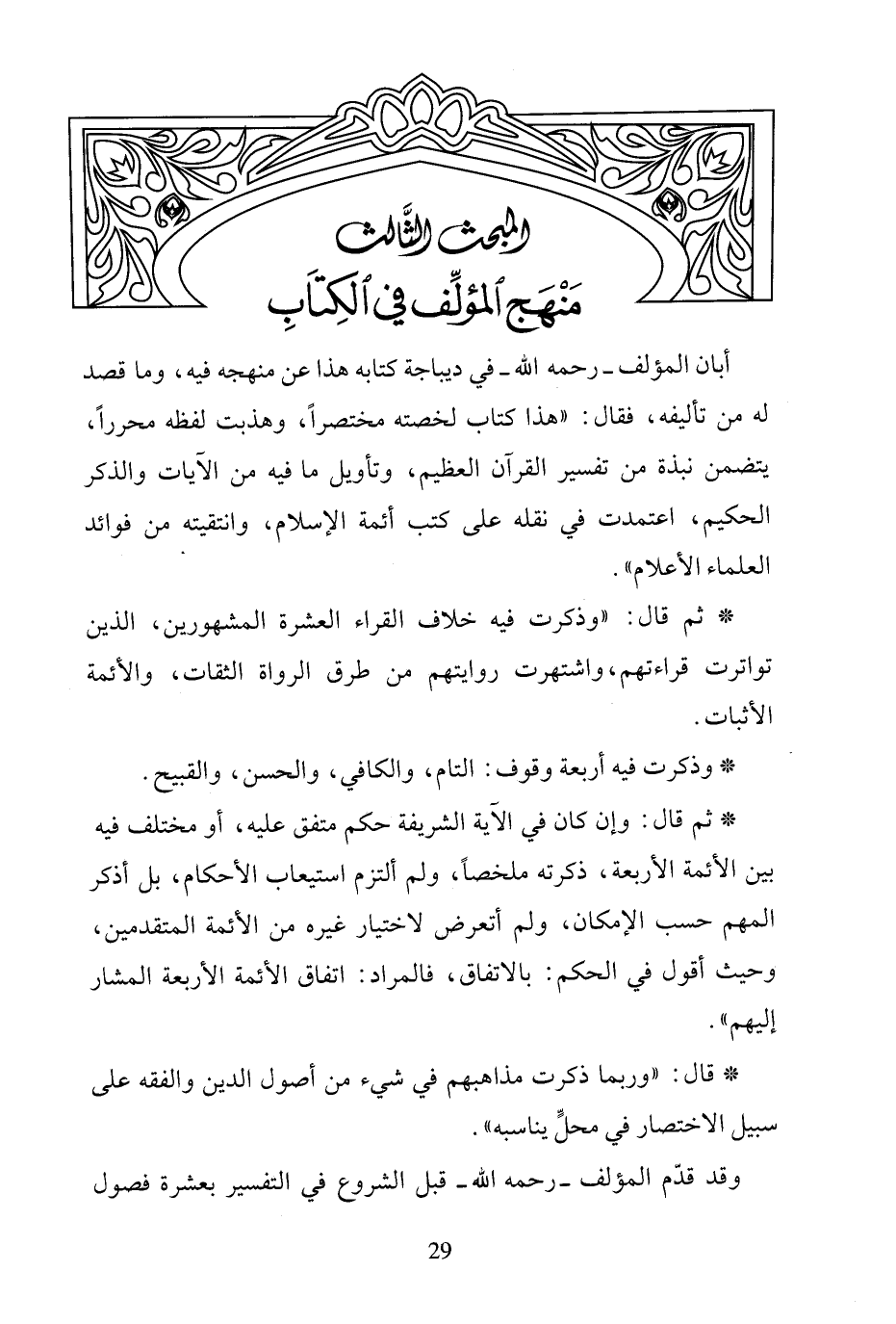 * ثم قال: وإن كان في الآية الشريفة حكم متفق عليه، أو مختلف فيه بين الأئمة الأربعة، ذكرته ملخصًا، ولم ألتزم استيعاب الأحكام، بل أذكر المهم حسب الإمكان، ولم أتعرض لاختيار غيره من الأئمة المتقدمين، وحيث أقول في الحكم: بالاتفاق، فالمراد: اتفاق الأئمة الأربعة المشار إليهم".