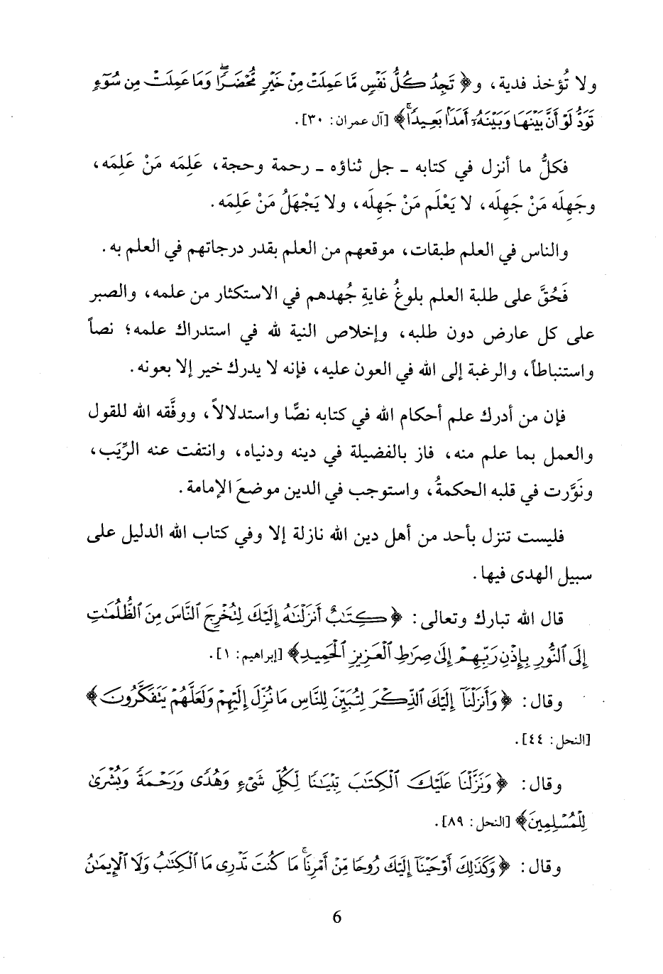 فإن من أدرك علم أحكام الله في كتابه نصًّا واستدلالًا، ووفَّقه الله للقول والعمل بما علم منه، فاز بالفضيلة في دينه ودنياه، وانتفت عنه الرِّيَب، ونَوَّرت في قلبه الحكمةُ، واستوجب في الدين موضعَ الإمامة.