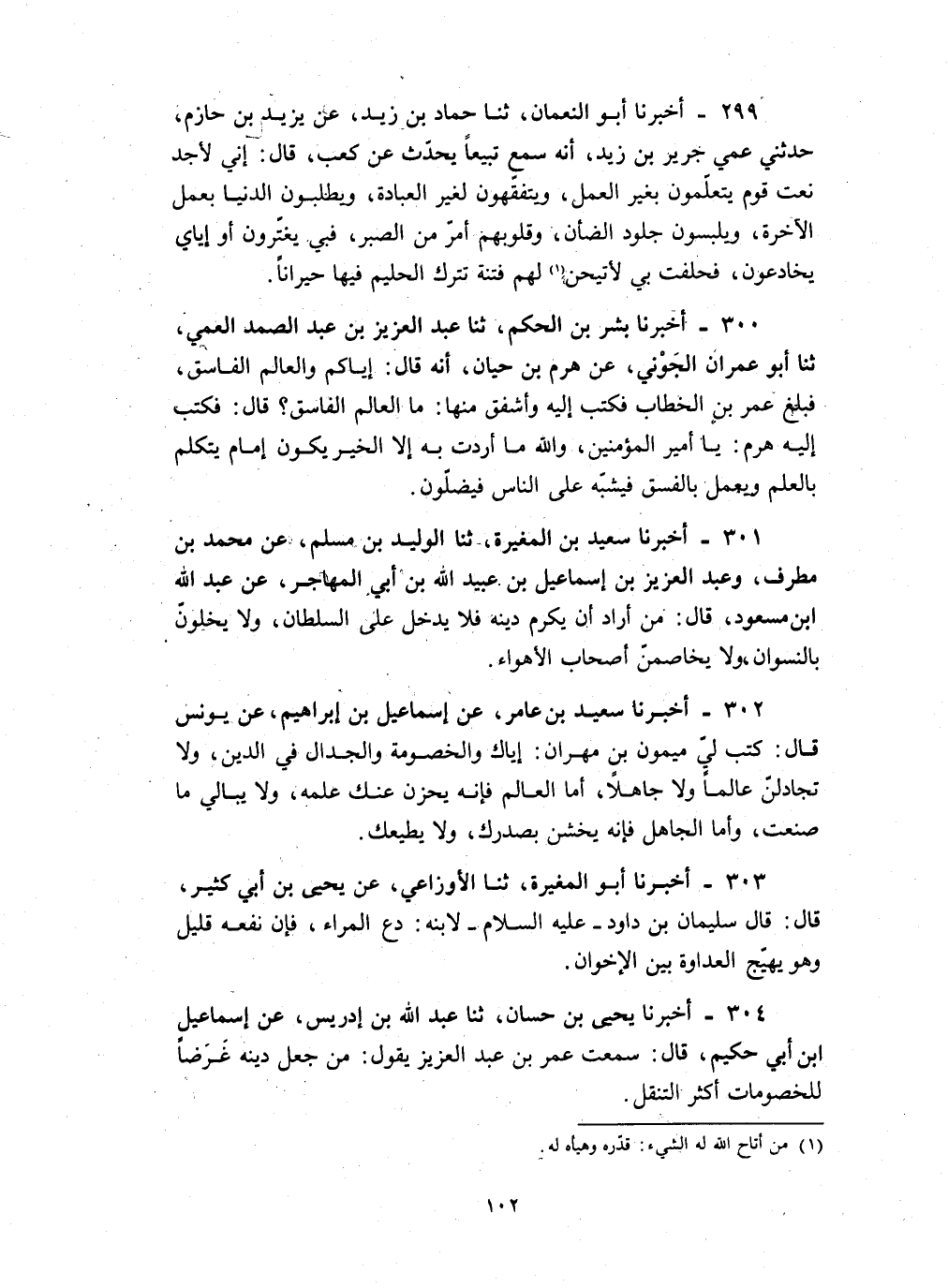 300 - أخبرنا بشر بن الحكم ثنا عبد العزيز بن عبد الصمد العمي ثنا أبو عمران الجوني عن هرم بن حيان انه قال : إياكم والعالم الفاسق فبلغ عمر بن الخطاب فكتب إليه وأشفق منها ما العالم الفاسق قال فكتب إليه هرم يا أمير المؤمنين والله ما أردت به الا الخير يكون إمام يتكلم بالعلم ويعمل بالفسق فيشبه على الناس فيضلون