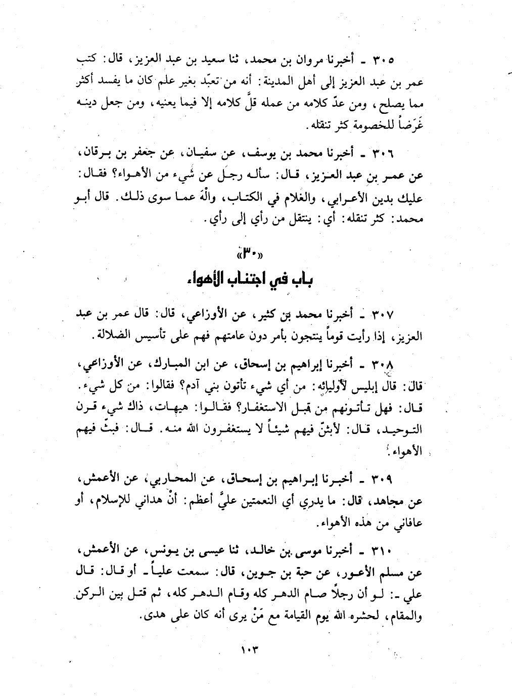 305 - أخبرنا مروان بن محمد ثنا سعيد بن عبد العزيز قال : كتب عمر بن عبد العزيز إلى أهل المدينة انه من تعبد بغير علم كان ما يفسد أكثر مما يصلح ومن عد كلامه من عمله قل كلامه الا فيما يعنيه ومن جعل دينه غرضا للخصومة كثر تنقله