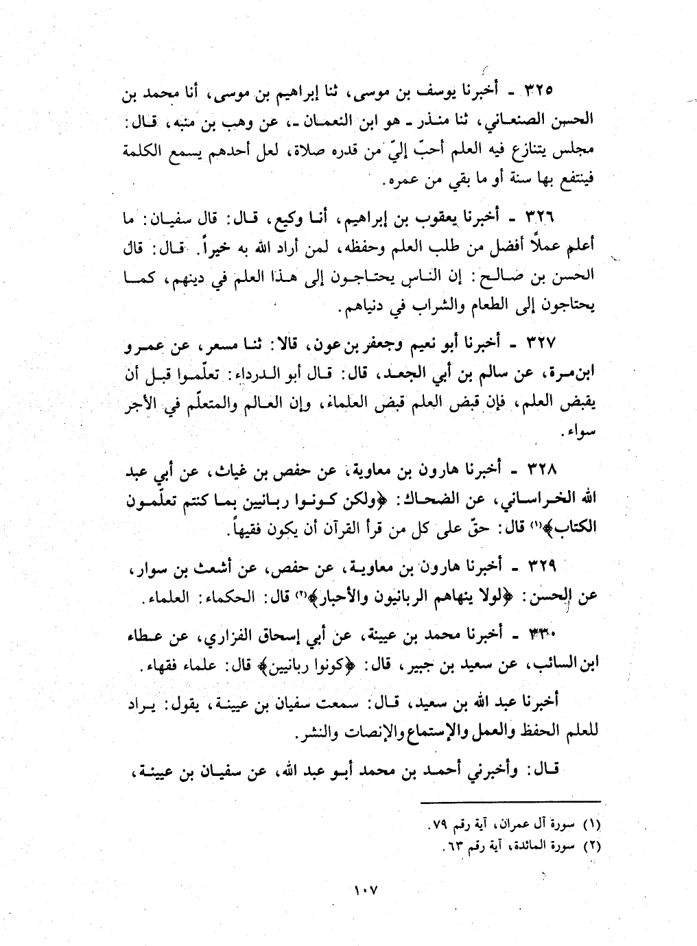 330 - أخبرنا محمد بن عيينة عن أبي إسحاق الفزاري عن عطاء بن السائب عن سعيد بن جبير قال : كونوا ربانيين قال علماء فقهاء أخبرنا عبد الله بن سعيد قال سمعت سفيان بن عيينة يقول يراد للعلم الحفظ والعمل والاستماع والإنصات والنشر قال وأخبرني أحمد بن محمد أبو عبد الله عن سفيان بن عيينة قال أجهل الناس من ترك ما يعلم واعلم الناس من عمل بما يعلم وأفضل الناس أخشعهم لله