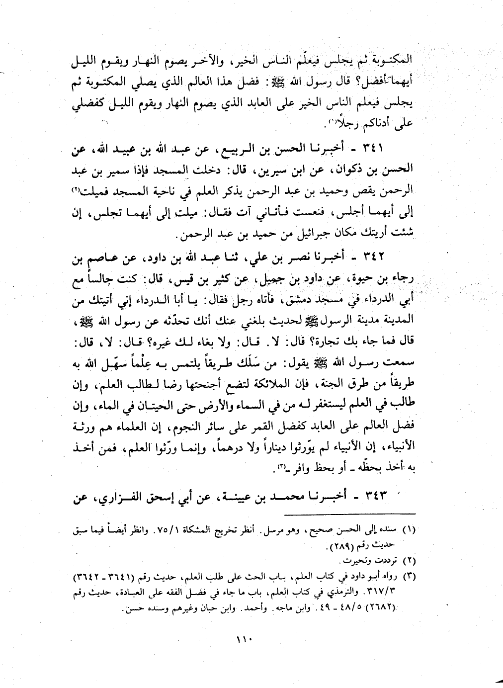 342 - أخبرنا نصر بن علي ثنا عبد الله بن داود عن عاصم بن رجاء بن حيوة عن داود بن جميل عن كثير بن قيس قال : كنت جالسا مع أبي الدرداء في مسجد دمشق فاتاه رجل فقال يا أبا الدرداء اني أتيتك من المدينة مدينة الرسول صلى الله عليه و سلم لحديث بلغني عنك انك تحدثه عن رسول الله صلى الله عليه و سلم قال فما جاء بك تجارة قال لا قال ولا بغاء لك غيره قال لا قال سمعت رسول الله صلى الله عليه و سلم يقول من سلك طريقا يلتمس به علما سهل الله به طريقا من طرق الجنة فإن الملائكة لتضع أجنحتها رضا لطالب العلم وان طالب في العلم ليستغفر له من في السماء والأرض حتى الحيتان في الماء وان فضل العالم على العابد كفضل القمر على سائر النجوم ان العلماء هم ورثة الأنبياء ان الأنبياء لم يورثوا دينارا ولا درهما وإنما ورثوا العلم فمن أخذ به أخذ بحظه أو بحظ وافر