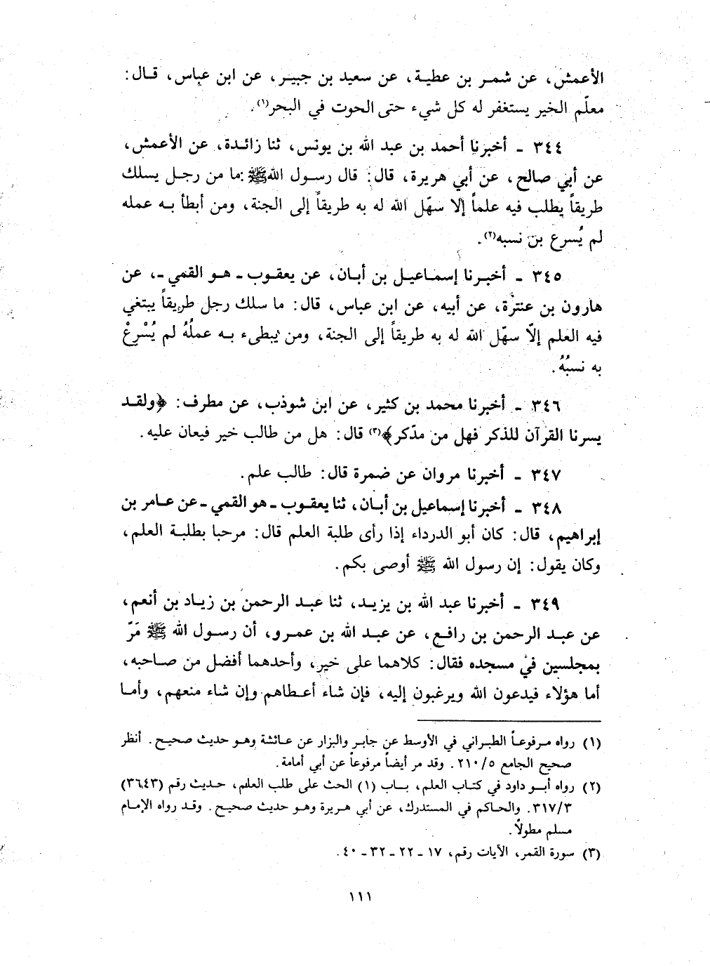 344 - أخبرنا أحمد بن عبد الله بن يونس ثنا زائدة عن الأعمش عن أبي صالح عن أبي هريرة قال قال رسول الله صلى الله عليه و سلم : ما من رجل يسلك طريقا يطلب فيه علما الا سهل الله له به طريقا إلى الجنة ومن أبطأ به عمله لم يسرع به نسبه
