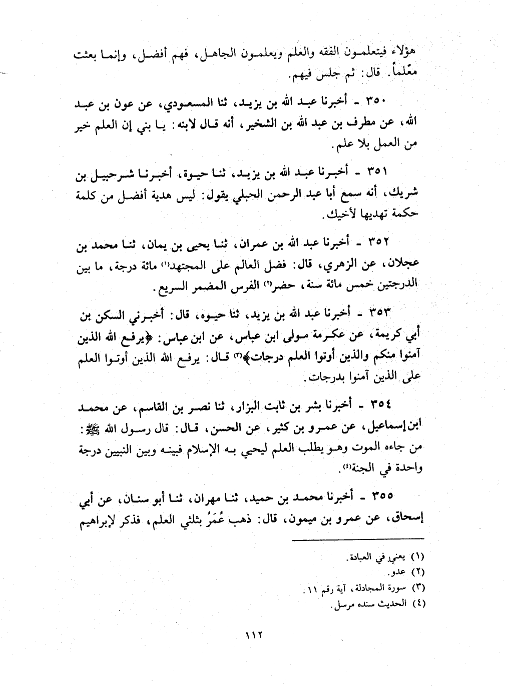 352 - أخبرنا عبد الله بن عمران ثنا يحيى بن يمان ثنا محمد بن عجلان : عن الزهري قال فضل العالم على المجتهد مائة درجة ما بين الدرجتين خمس مائة سنة حضر الفرس المضمر السريع