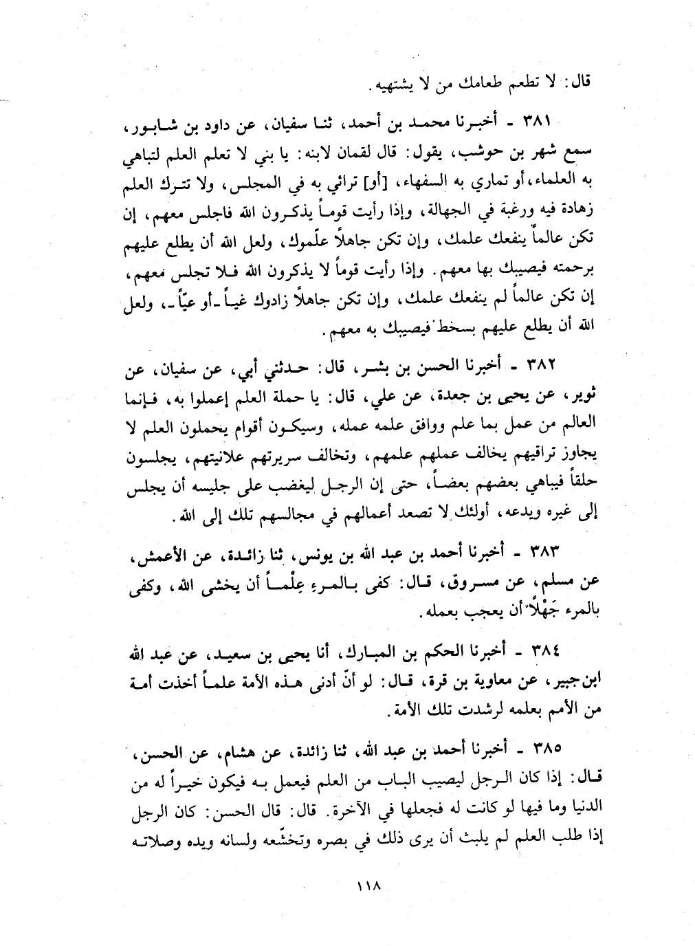 383 - أخبرنا أحمد بن عبد الله بن يونس ثنا زائدة عن الأعمش عن مسلم عن مسروق قال : كفى بالمرء علما ان يخشى الله وكفى بالمرء جهلا ان يعجب بعمله