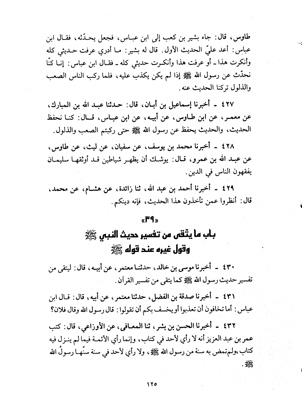 430 - أخبرنا موسى بن خالد حدثنا معتمر عن أبيه قال : ليتقى من تفسير حديث رسول الله صلى الله عليه و سلم كما يتقى من تفسير القرآن