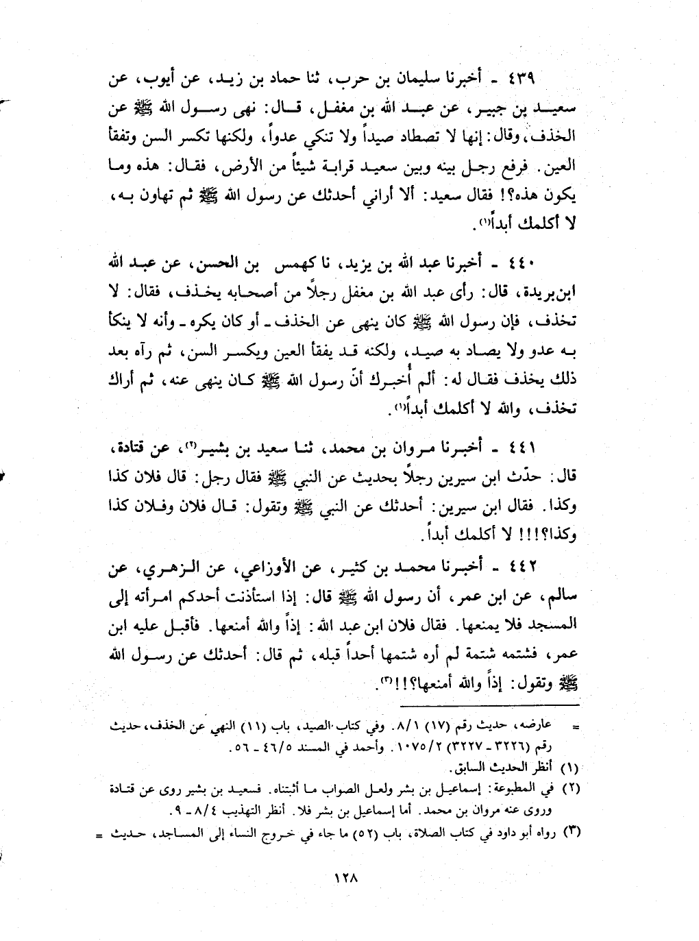 439 - أخبرنا سليمان بن حرب ثنا حماد بن زيد عن أيوب عن سعيد بن جبير عن عبد الله بن مغفل قال : نهى رسول الله صلى الله عليه و سلم عن الخذف وقال إنها لا تصطاد صيدا ولا تنكي عدوا ولكنها تكسر السن وتفقأ العين فرفع رجل بينه وبين سعيد قرابة شيئا من الأرض فقال هذه وما يكون هذه فقال سعيد الا أراني أحدثك عن رسول الله صلى الله عليه و سلم ثم تهاون به لا أكلمك أبدا