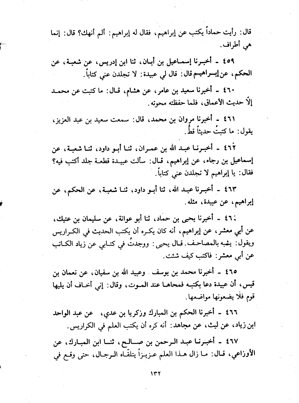 459 - أخبرنا إسماعيل بن أبان ثنا بن إدريس عن شعبة عن الحكم عن إبراهيم قال قال لي عبيدة : لا تجلدن عني كتابا
