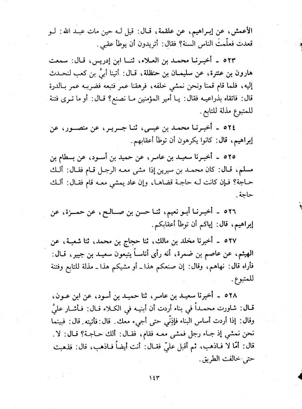 524 - أخبرنا محمد بن عيسى ثنا جرير عن منصور عن إبراهيم قال : كانوا يكرهون ان توطأ أعقابهم
