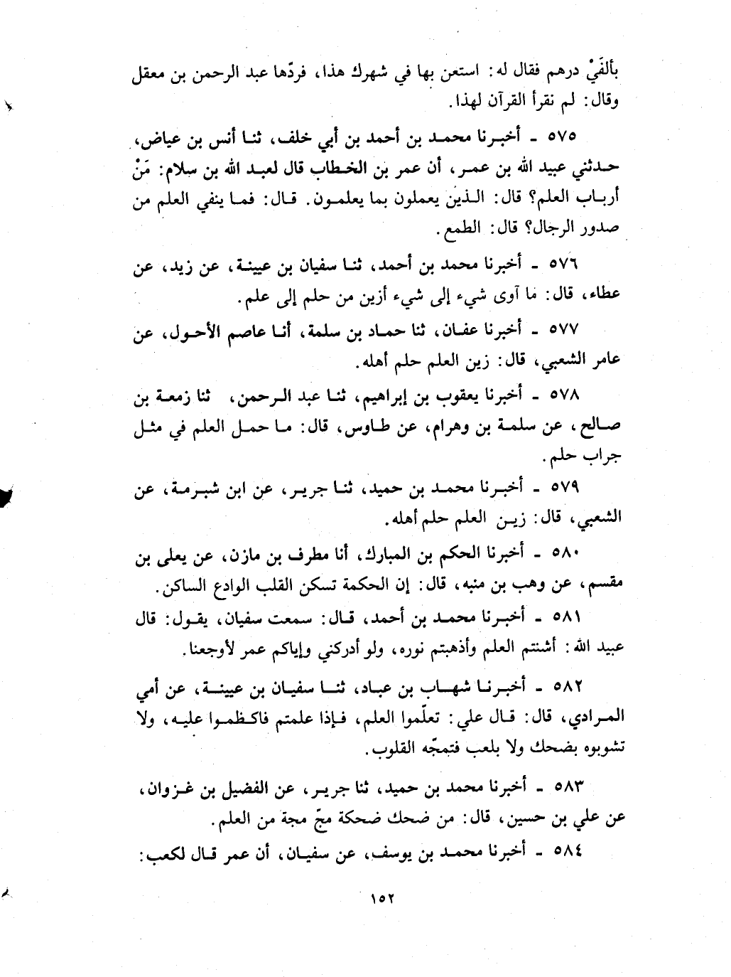 575 - أخبرنا محمد بن أحمد بن أبي خلف ثنا أنس بن عياض حدثني عبيد الله بن عمر أن عمر بن الخطاب قال لعبد الله بن سلام : من أرباب العلم قال الذين يعملون بما يعلمون قال فما ينفي العلم من صدور الرجال قال الطمع