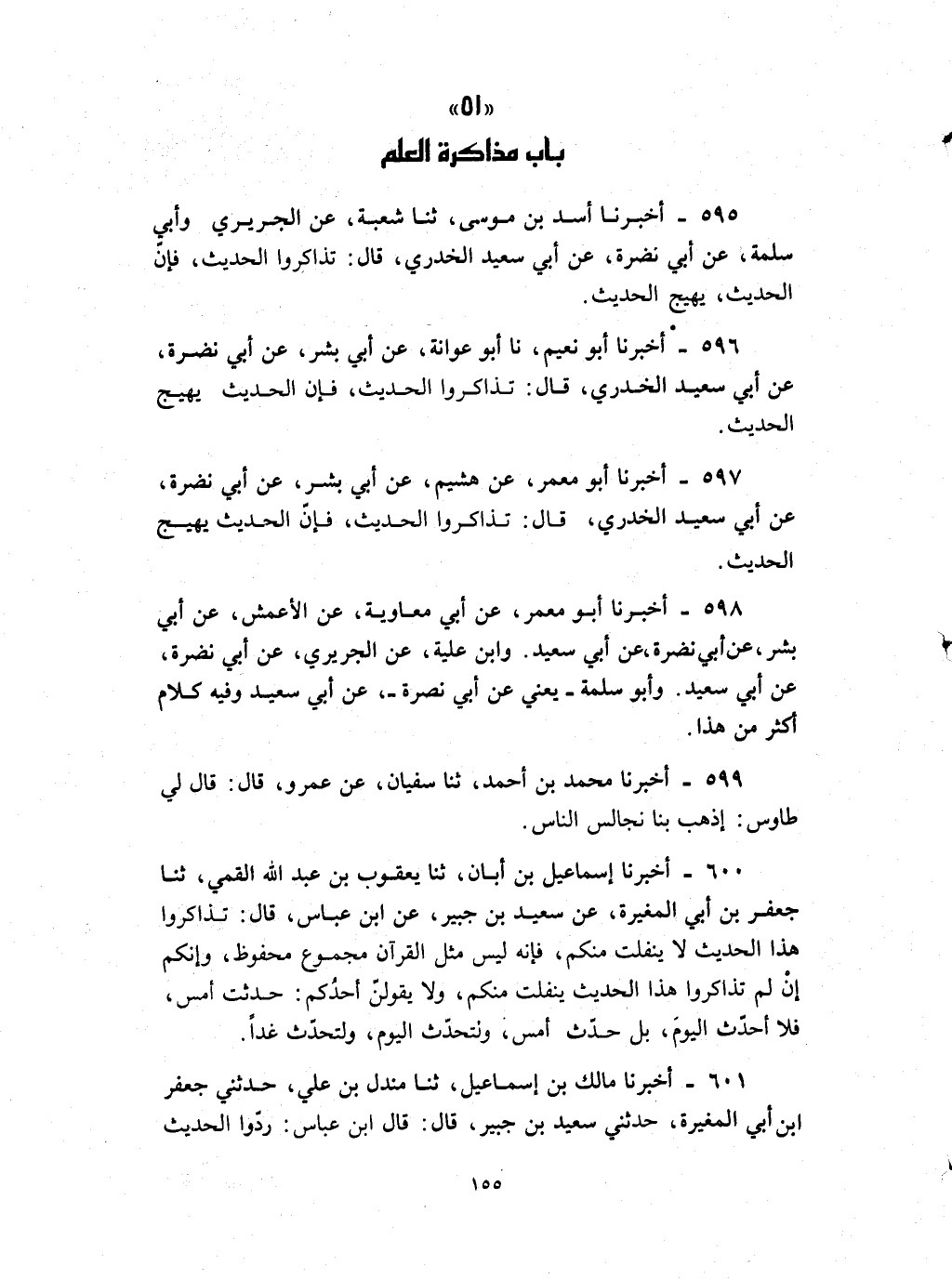595 - أخبرنا أسد بن موسى ثنا شعبة عن الجريري وأبي سلمة عن أبي نضرة عن أبي سعيد الخدري قال : تذاكروا الحديث فإن الحديث يهيج الحديث