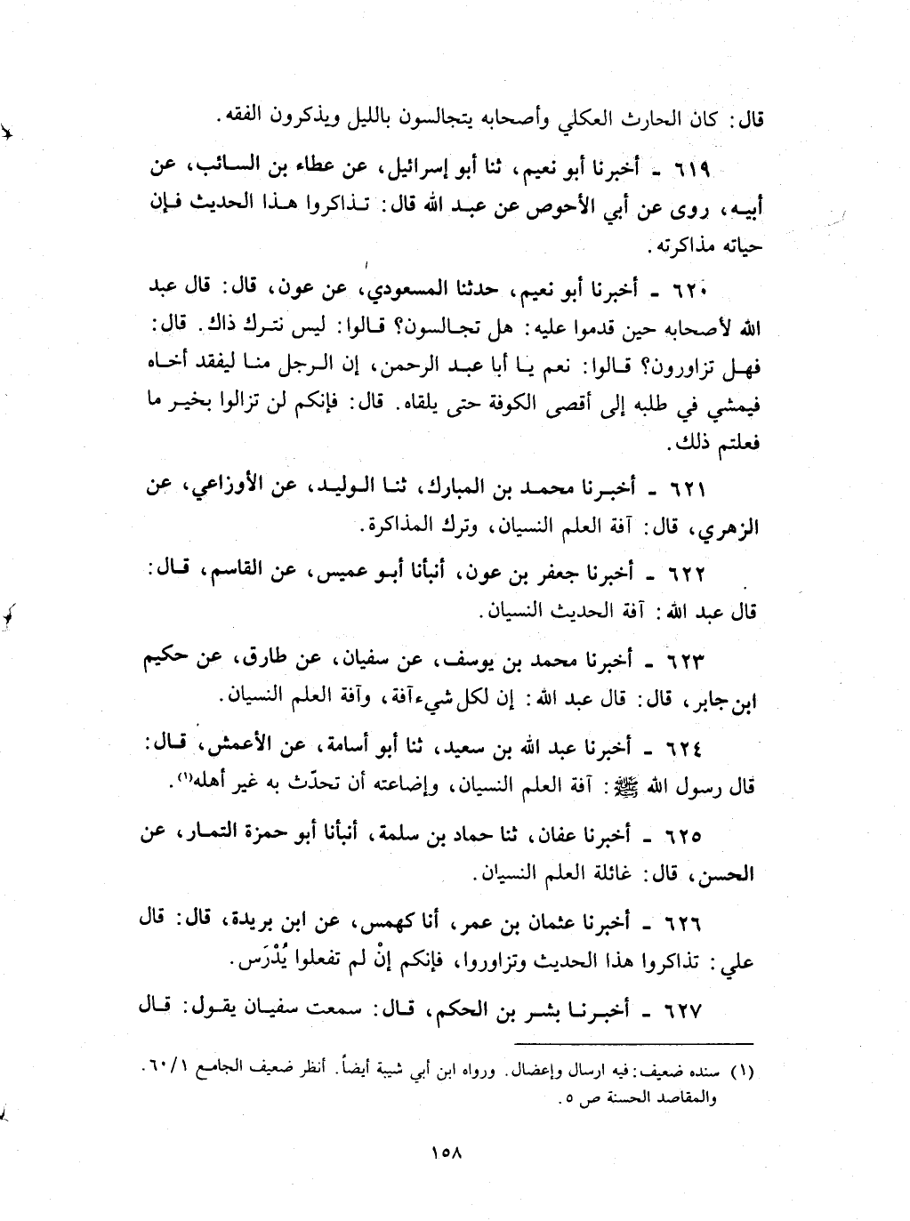 619 - أخبرنا أبو نعيم ثنا أبو إسرائيل عن عطاء بن السائب عن أبيه روى عن أبي الأحوص عن عبد الله قال : تذاكروا هذا الحديث فإن حياته مذاكرته